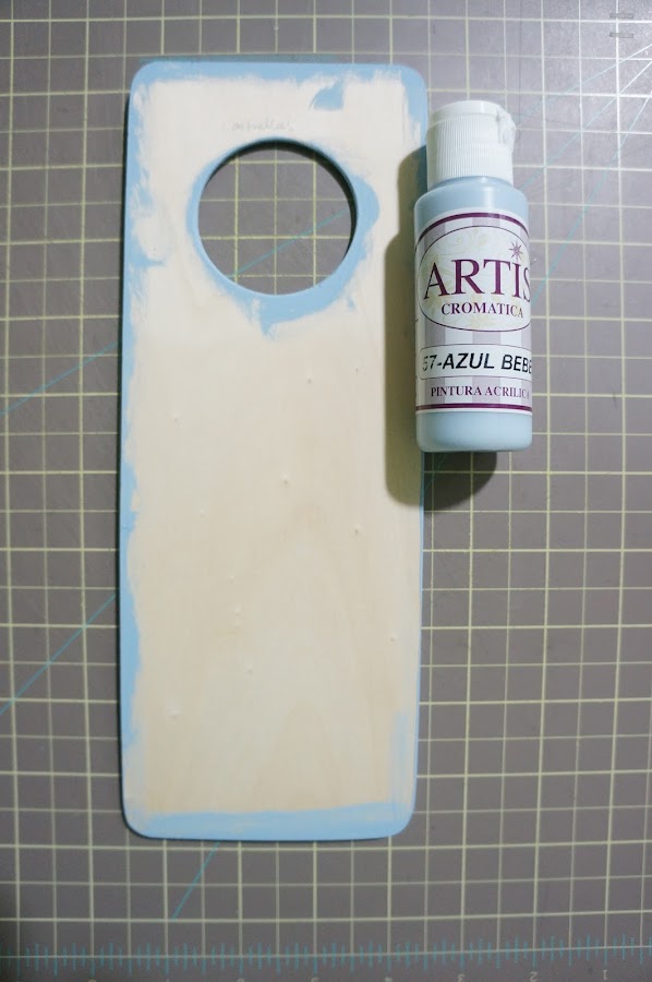 Con pintura acrílica pintamos los bordes de la pieza de madera (ahora sí, jeje) y una vez bien seco pegamos las piezas de papel.