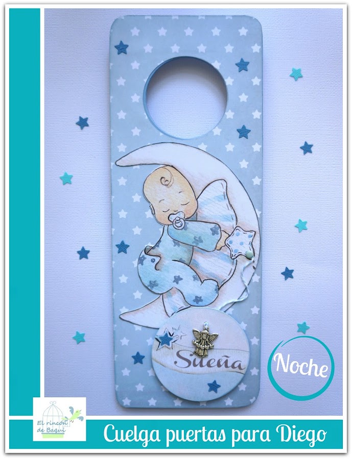 Para la NOCHE, he recortado el bebé en la luna y he troquelado en círculo la palabra Sueña, que he pegado con almohadillas para hacer efecto 3D. Con un brad y un trocito de cinta he colocado un angelito de metal.