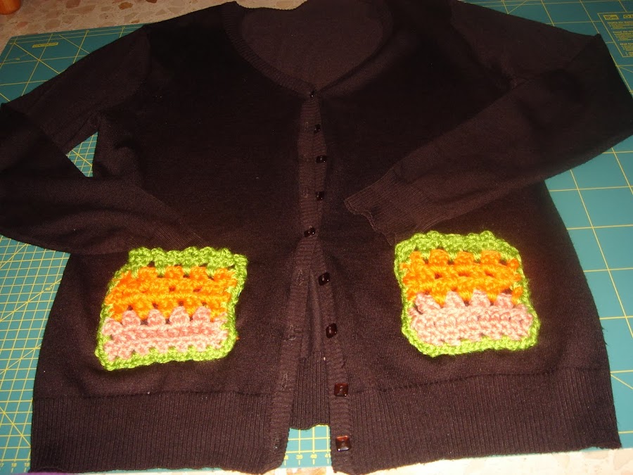 Para empezar necesitamos una chaqueta de punto basica, no importa el color y unos bolsillo o cuadrados de ganchillo en colores que combinen con la chaqueta.
