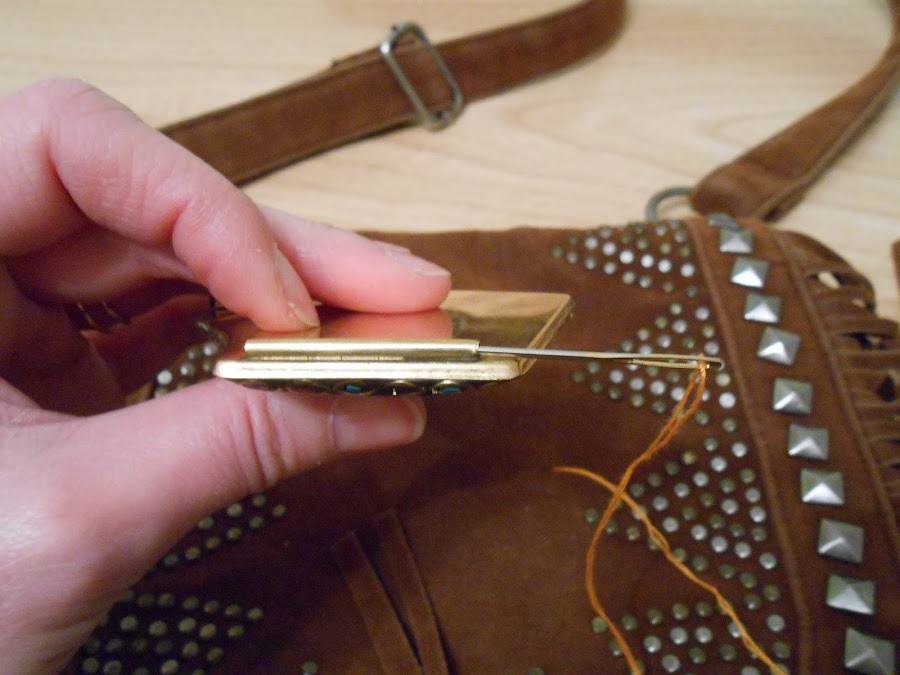 El procedimiento es bastante sencillo; la pieza metálica tenía dos pequeñas aberturas por la parte trasera que me permitieron unirla al bolso con unas puntadas, así que como os imaginaréis tarde cinco minutos en hacer este Diy.