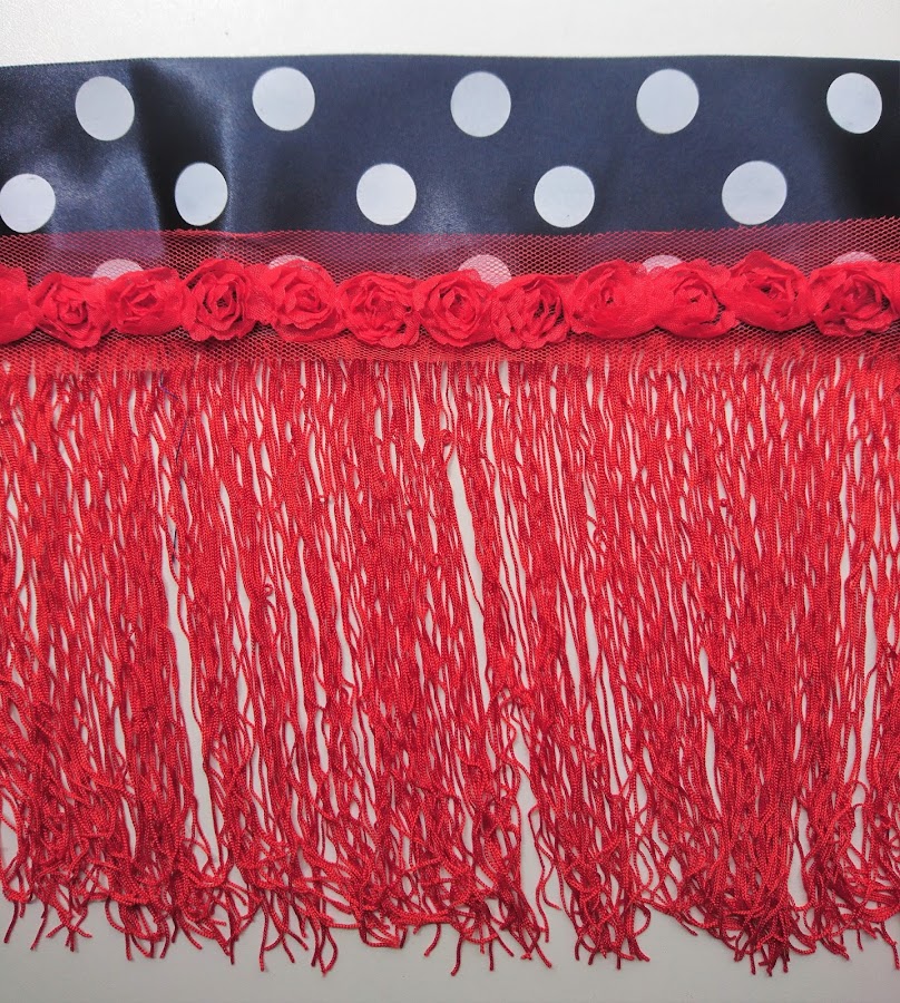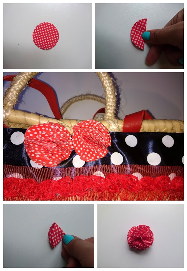Como broche final, haremos unas flores de tela, pues hemos utilizado motivos muy flamencos y creo que quedarán bonitas y originales. Para realizar cada flor (Hice dos) necesitaremos 10 círculos de tela del tamaño que más nos guste, pero hay que pensar que a más grande el círculo, más grande es la flor. Hacerlas es muy sencillo, tendremos que doblar a la mitad el cículo y volver a doblarlo para que nos quede un cuarto de círculo, cosemos la punta y una vez tengamos todos los círculos cosidos de esta manera, los unimos entre sí, dando forma a la flor.