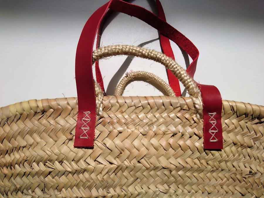 Para empezar cortaremos dos tiras de cuero de 2 cm de ancho por 70 cm de largo, que usaremos como asa del capazo para poder colgarlo del hombro. Una vez que tenemos las piezas hechas las cosemos a la altura deseada.