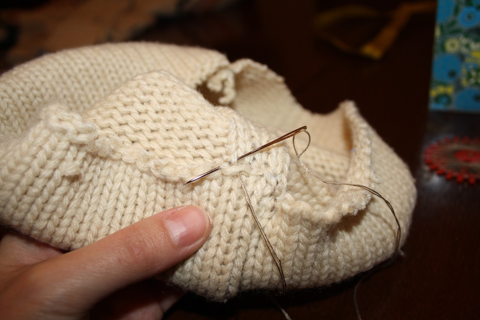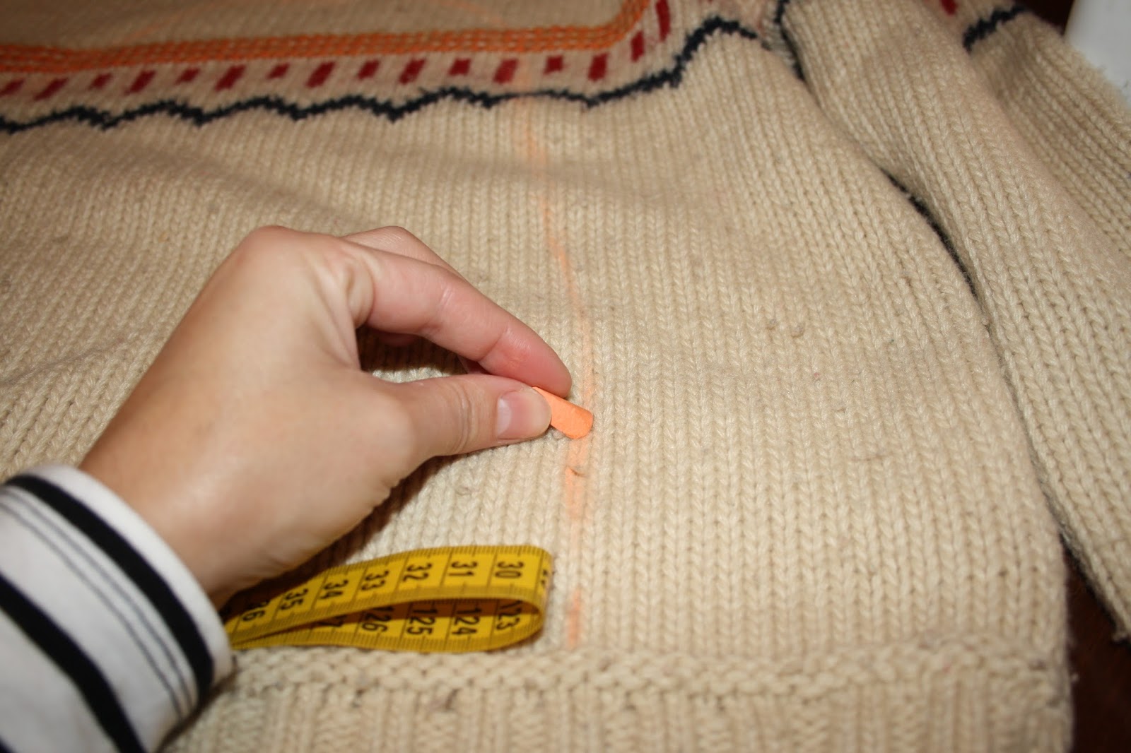 Marcamos con tiza un trozo en forma de gorro largo, desde el bajo del jersey hacia la parte de arriba, como veis en la foto. Siempre va a ser mejor que sobre, que no que falte, así que no tengáis miedo en cortar de más.