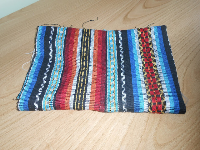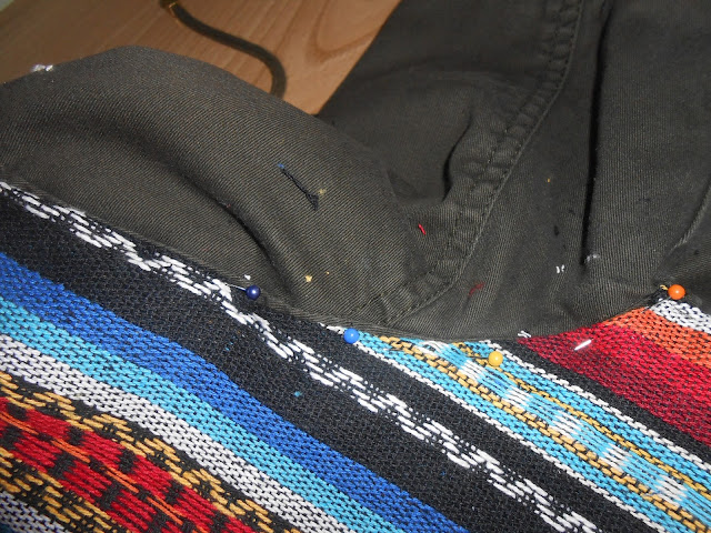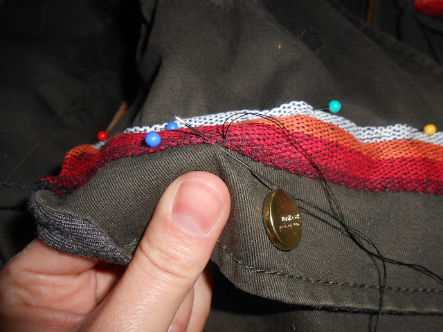 Y una vez acabada la espalda, comenzamos con los bolsillos. Como he escogido una tela de rayas horizontales, hemos de encontrar dos trocitos con el mismo dibujo para que quede simétrico. Y repetimos operación: ponemos la tela encima del bolso, cortamos el sobrante mientras vamos fijando la tela al bolsillo original con alfileres y después cosemos a mano.