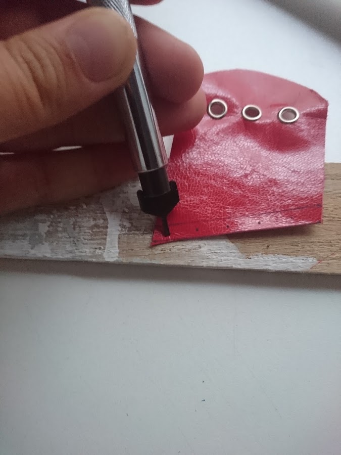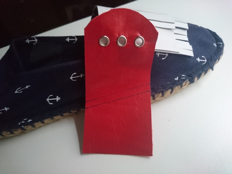 En las piezas que nos quedan, haremos los ojales con ayuda del sacabocados y colocaremos los ojales metálicos (para facilitar el movimiento del cordón), y haremos unos agujeros (marcamos la altura de la pieza a nuestro gusto con ayuda de la regla, tomando la suela de guía), en la parte recta de la pieza para coser el cuero a la suela de la alpargata, con el punto festón.