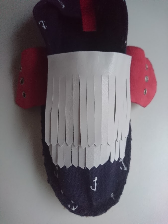 Para acabar, colocaremos el cordón y en la punta de éstos un par de abalorios de madera (en mi caso, coloqué también un ancla metálica). También corte en pico el final de cada fleco para que luzcan más las lengüetas.