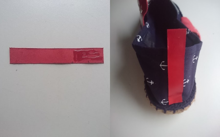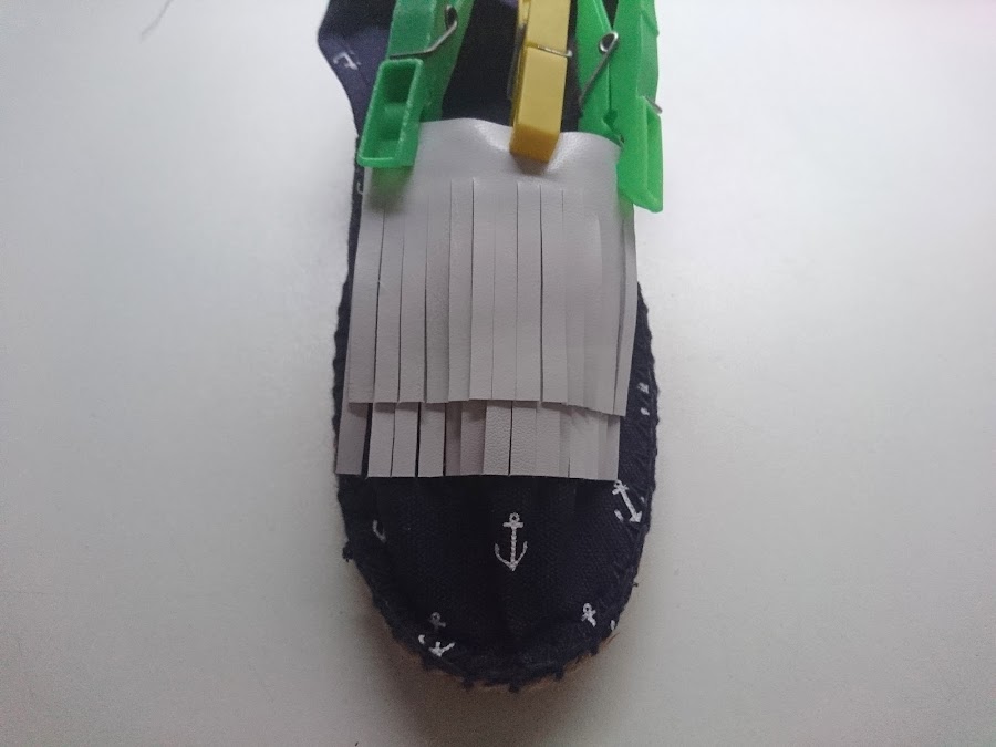 Una vez que ya tenemos las piezas pasadas al cuero y cortadas, vamos a ir colocandolas en las alpargatas. Para empezar, pegaremos las lengüetas de flecos una encima de otra, y una vez esté seca la lengüeta la pegaremos a la tela buscando el medio de la pieza y de la alpargata (Para que se pegue bien, uso unas pinzas de la ropa). Para continuar con y terminar con el pegamento, echamos pegamento a 1.5 cm del borde de la pieza más delgada, doblamos el extremo y luego pegamos esa pieza a la parte trasera de la alpargata.