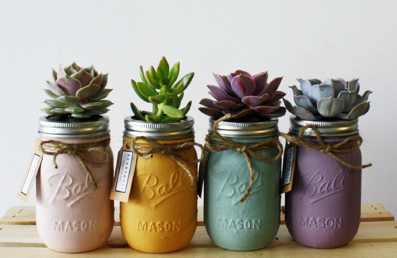 Otra excelente idea es la de reciclar los vasos de vidrio de los batidos para crear unas macetas auténticas. Pinta los frascos por fuerva de diversos colores, llénalos con tierra y pon tus plantas preferidas en ellos. Puedes perforar la tapa para que se vean como en la imagen y colocar un bonito lazo alrededor.