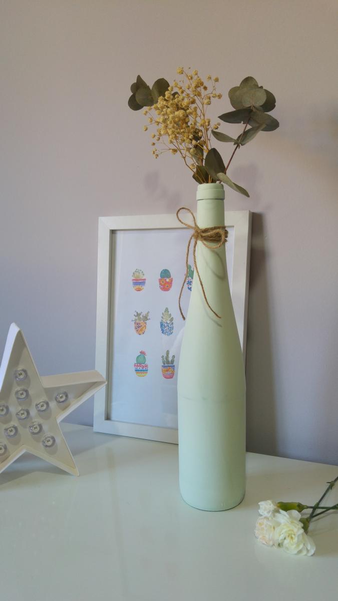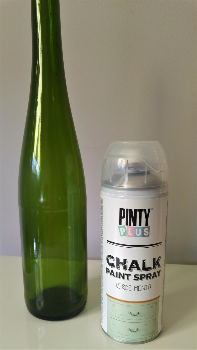 Para reutilizar la vieja botella de vino, utilizamos el Spray Chalkpaint. Des de que lo descubrí gracias a los chicos de Idoproyect, no utilizo otro formato de pintura. Se seca en menos de 5 minutos, no ensuciamos y es de lo más cómodo. ¡Totalmente recomendable!