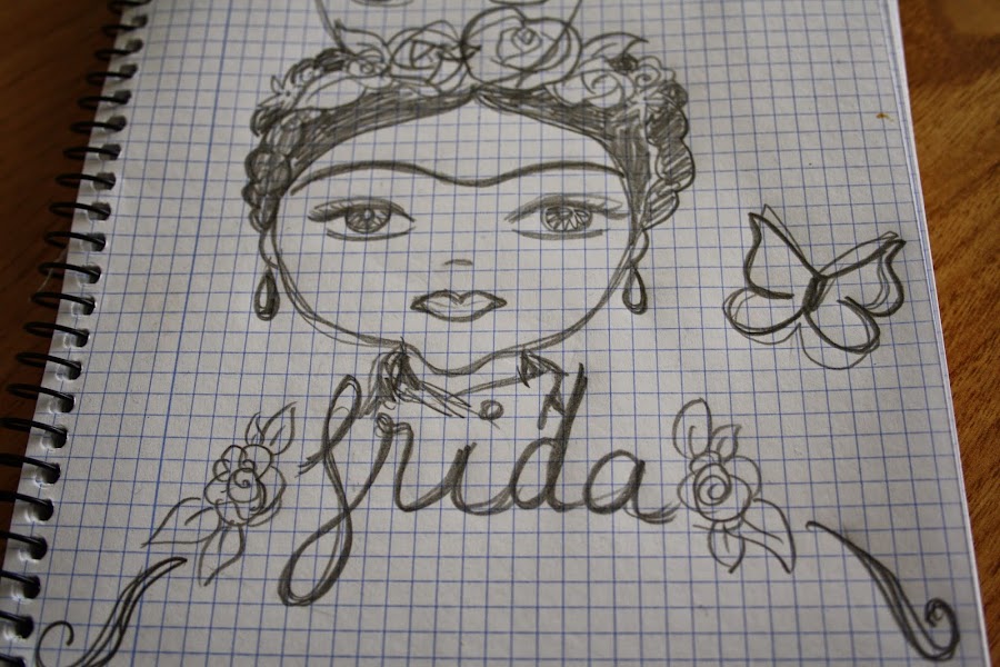 Este ha sido mi boceto: una mini Frida Kalho, porque sus cuadros de colores me chiflan y me rechiflan.