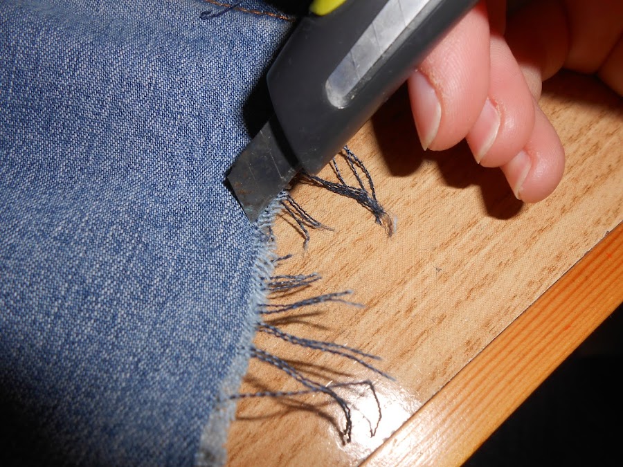 A continuación desflecamos con la ayuda de un cuter. Simplemente tenéis que ir sacando los hilos para conseguir un efecto del fleco y que nos quede un poco desaliñado.