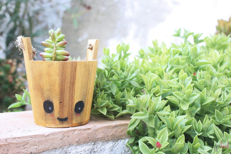 Así de mona ha quedado mi cesta-maceta, el fallo de insistir demasiado con el barniz cuando todavía no estaba seco el rotulador se disimula un poco por las vetas oscuras que tiene la madera.