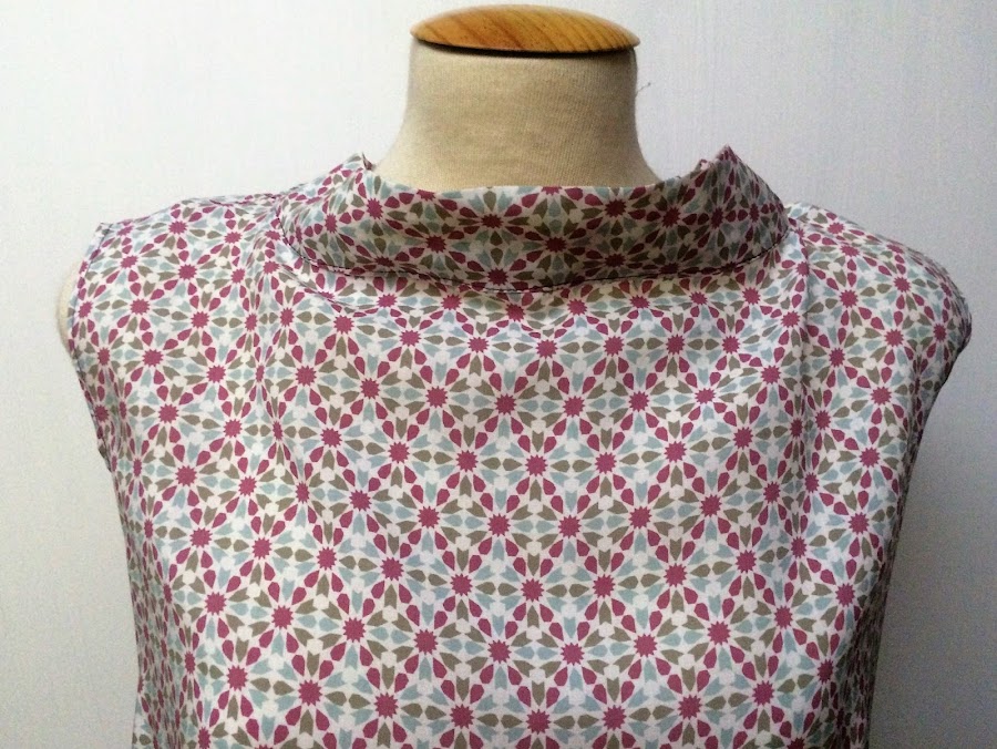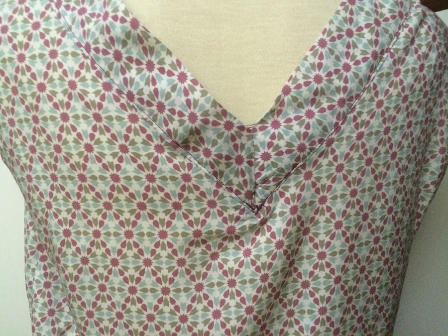 Como veis elegí poner un escote en la espalda y por la parte de delante la deje cerrada, pegada al cuello. Esta tela es una viscosa estampada con una caída fabula, y nos dará mucho juego. Es muy ponible sola en verano, con faldas, pantalones.... pero también podemos seguir utilizándola ahora cuando comience a refrescar, con una chaqueta queda ideal. Ya os la iré mostrando para que podáis verla.