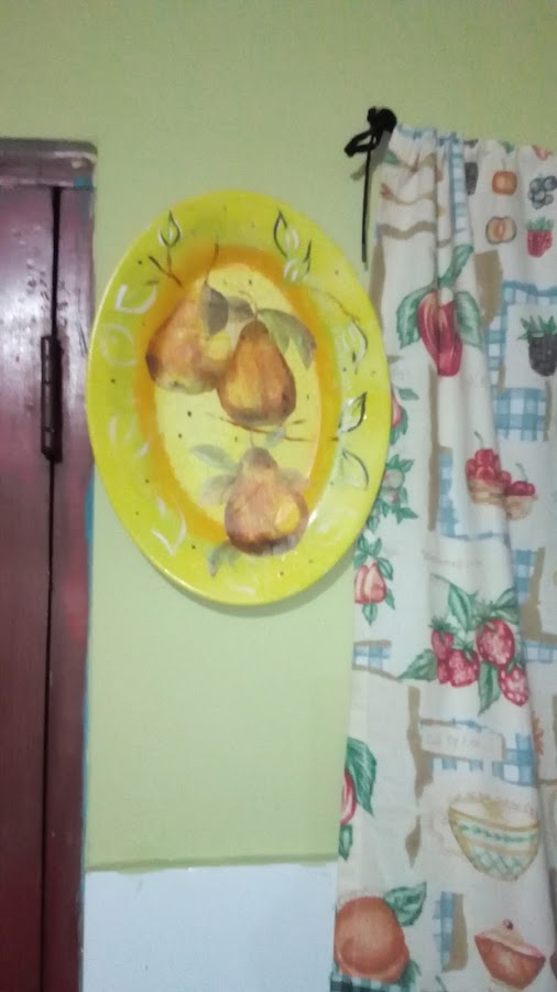 Cuando secaron con un pincel fino resalte ciertos colores y tonos de las frutas, con el revés del pincel pinte unos puntos dispersos alrededor del plato en color marrón y listo. Ya están para colgarse y lucir mi cocina :D