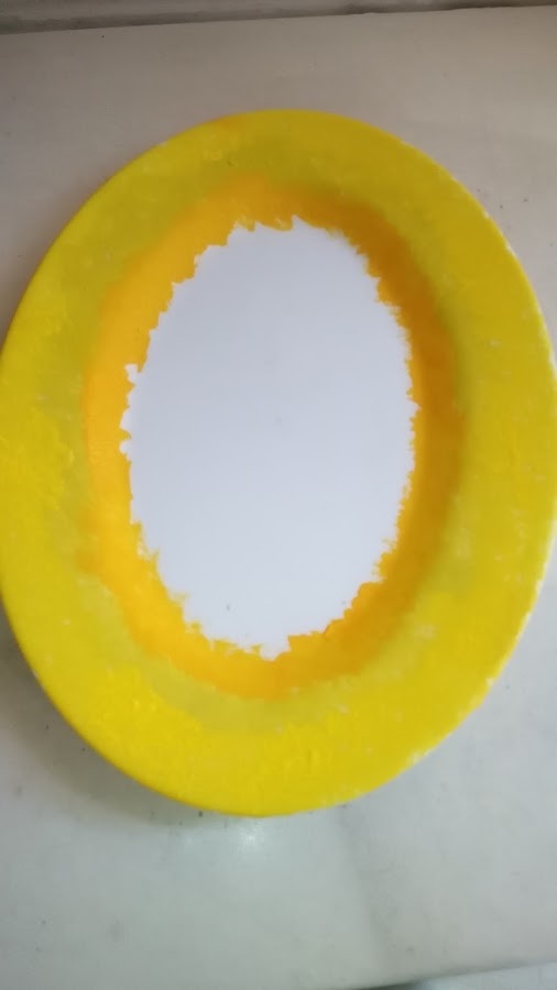 El proceso de elaboración es simple y fácil, he tomado un pincel redondo de cerdas suaves. He moteado todo el alrededor o marco del plato con tres franjas, una cada color de los 3 tonos amarillo elegidos.