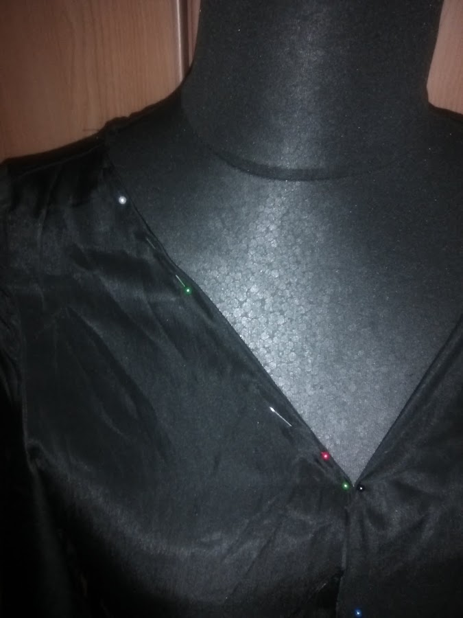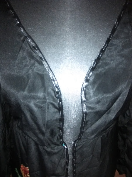 Una vez marcado el escote, le puse un bies negro todo alrededor de la abertura de lo que ya esta siendo la chaqueta.