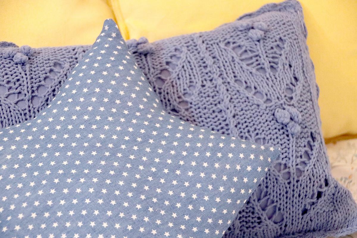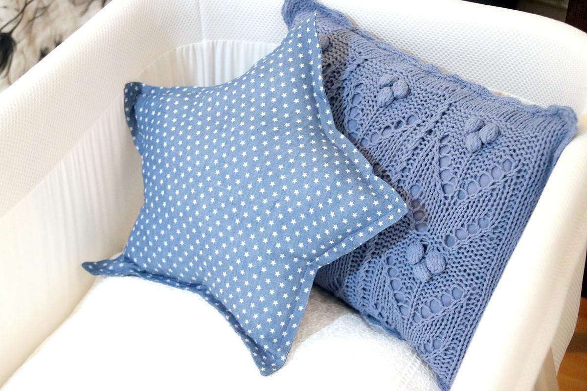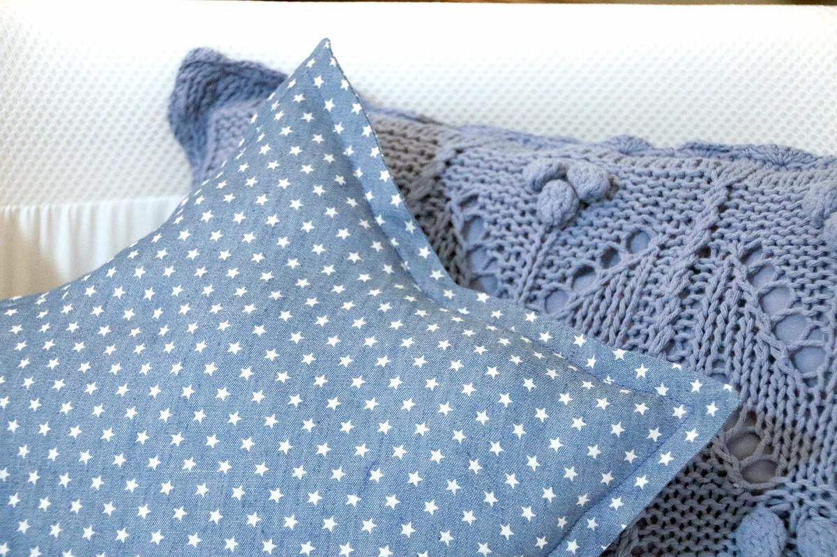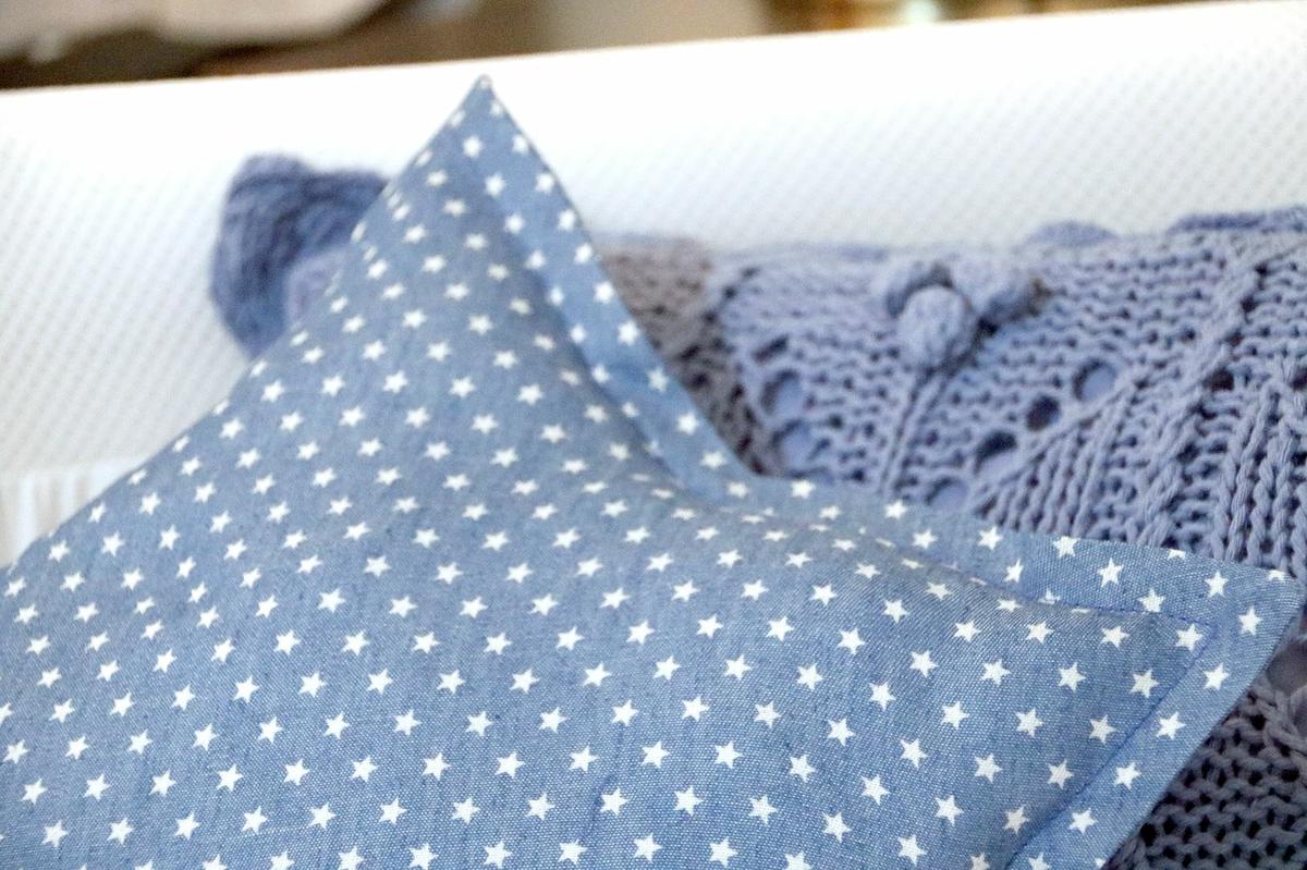 La tela que he utilizado para este cojín es una tela vaquera o denim muy finita con estampado de estrellas.