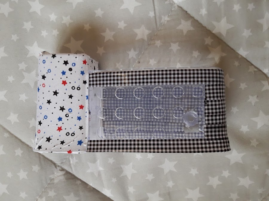 A continuación, forramos la parte que queremos cubrir. En mi caso, solo forré con tela uno de los compartimentos, ya que el otro tenía agujeros y era más sencillo hacerlo con washi-tape