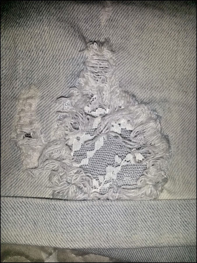 En mi caso, quise cubrir los rotos con el encaje más ancho y el más fino lo usé para decorar las costuras de los bolsillos.