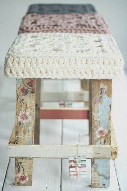 Se me ocurrió hacer un granny square básico para la parte de arriba y luego un par de filas de puntos altos para que encajase en el taburete