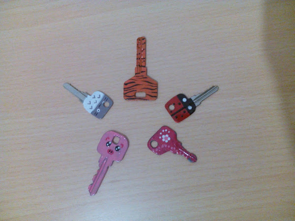 Tenía algunas llaves antiguas por casa, de estas que ya no utilizaba, y en vez de tirarlas, pensé en pintarlas y así de chulis quedaron ^^