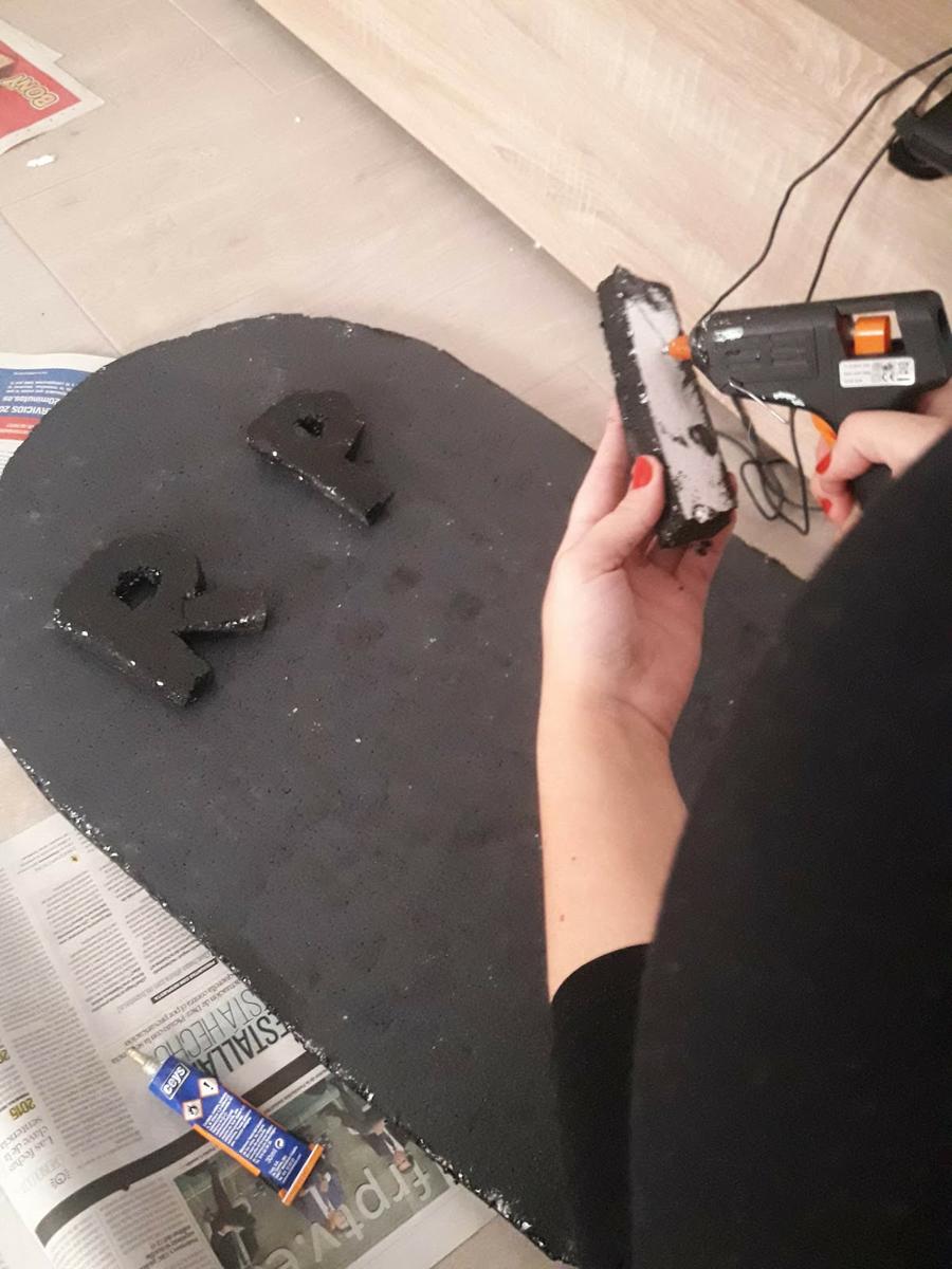 Las letras las corté con el cúter y las pinté de negro. Después las fui pegando con silicona caliente.