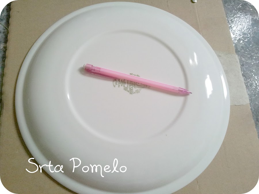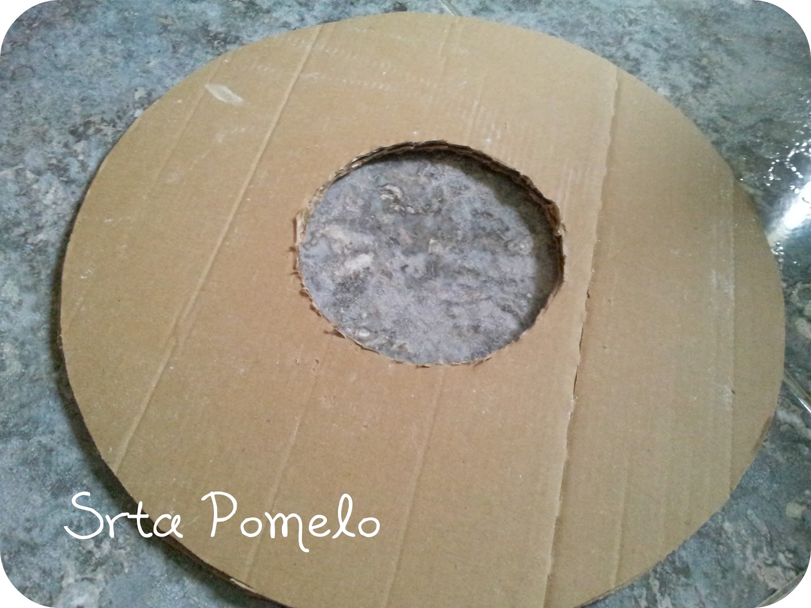 Empezaremos marcando sobre el cartón con la ayuda de algo redondo, un plato o un compás. Haremos dos cículos, uno más grande y otro más pequeño en el centro. Recortaremos el contorno.
