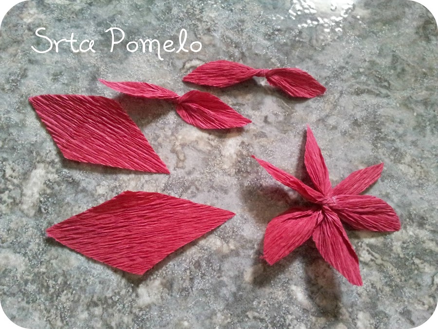 Con unos trozos de papel crepe rojo haremos unas flores. Racortaremos varios rombos, los retorcemos por el centro y pegamos de tres en tres para hacer una flor.