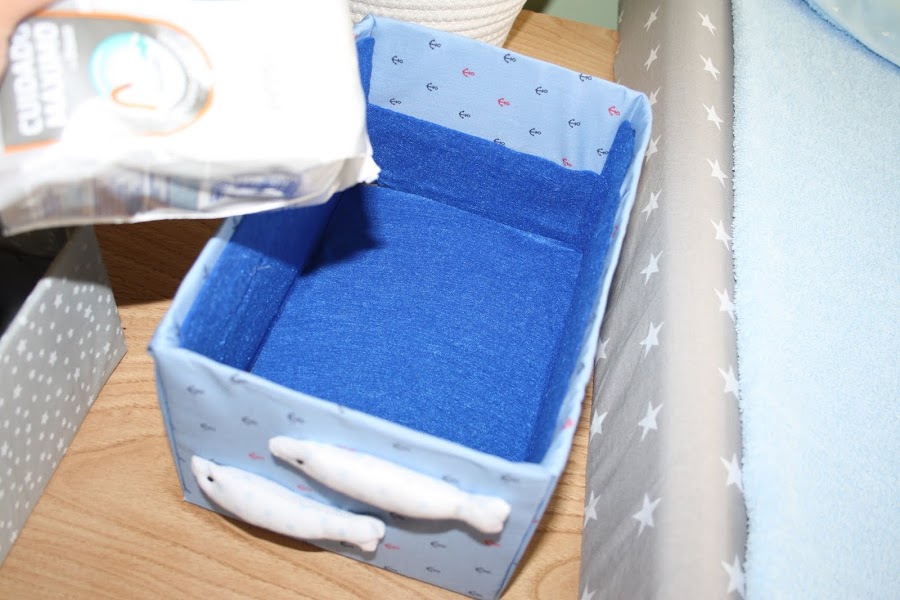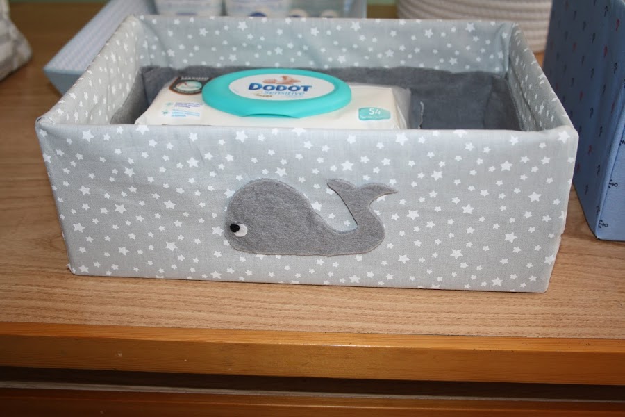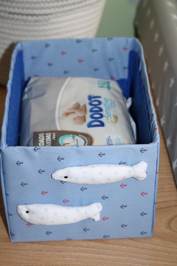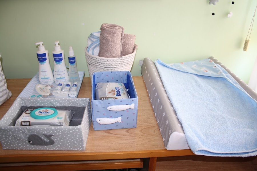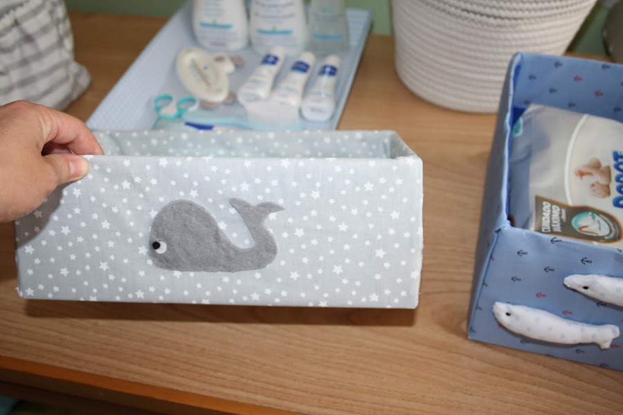 También me pareció buena idea forrar cajas de cartón para meter pañales, toallas, cremitas, toallitas hñumedas, aceites, etc. Creo que un buen almacenaje es fundamental para tener sus cosas bien organizadas y a mano y no perder tiempo buscándolas en armarios.