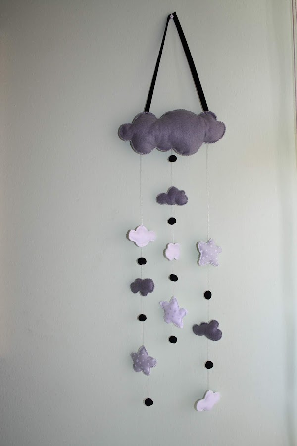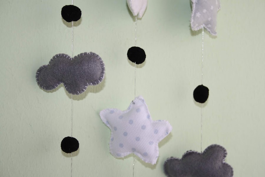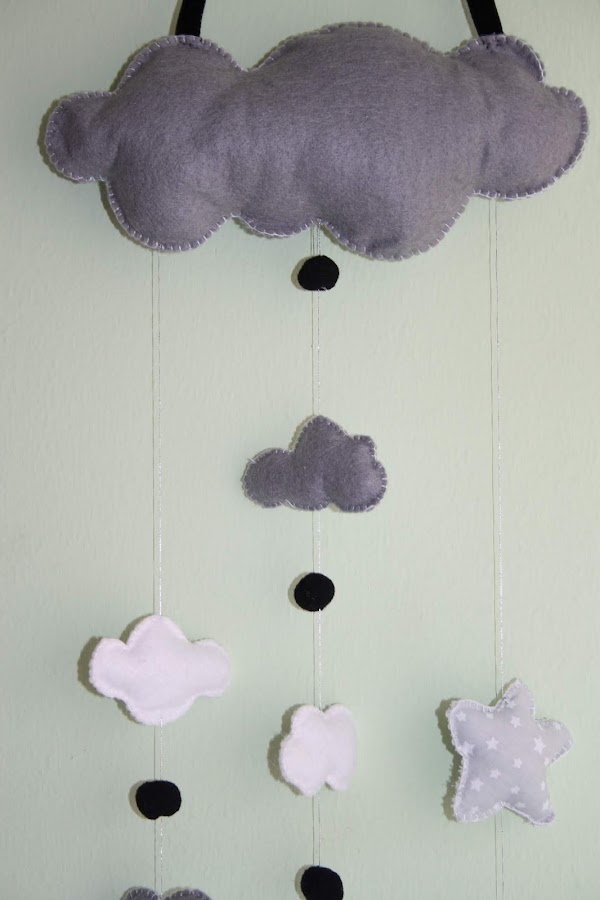 Lo que sí hice fue coserle un móvil de fieltro en blancos, grises y negros, que son los colores que los bebés diferencian nada más nacer. En realidad, sólo ven sombras y luces, a pesar que tienen el sentido de la vista perfectamente desarrollado. Es un proceso madurativo que les llevará algo de tiempo, con lo cual para las primeras semanas me pareció que este móvil era de lo más apropiado para nuestro bollito. Mientras que le cambie el pañal podrá estar entretenido mirando el móvil (y más trastos que tengo en esa habitación, seguro que no se aburre, por lo menos al principio).