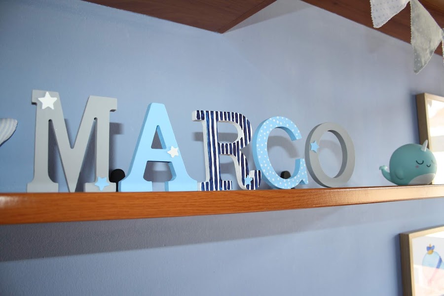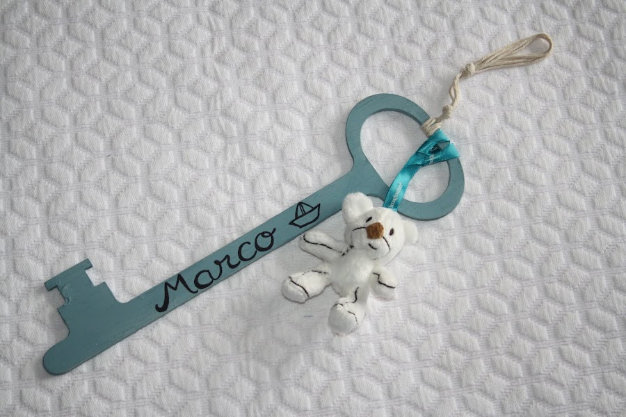 Y ya por último, os enseño esta llave de madera personalizada que he colocado en uno de los pomos de un armario. Para cuando sea un poco mayor, se le puede colgar un saco de semillas de olor y colgarlo al lado de su ropita.