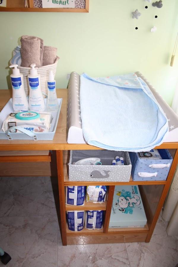 Zona del cambiador/bañeraLa zona del cambiador/bañera es una zona aprovechable de un escritorio que nos regalaron hace tiempo. Al tener ya los muebles dispuestos en casa era inviable meter otros propios de bebé, así que tuvimos que adaptarnos a lo que había. Reestructuramos el mueble de manera que encima del propio escritorio pusimos el cambiador y al lado la bañerita (y lo pensamos así por lo menos mientras sea chiquitín y no chapotee mucho).