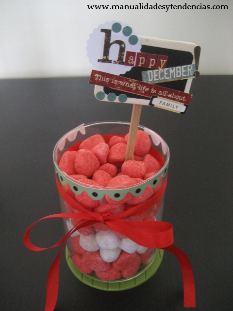 Joyeuses fêtes! Voici une autre idée pas chère pour décorer la maison pendant les fêtes de Noël. Il faut remplir un bocal avec des friandises blanches et rouges et mettre une petite affiche faite avec du scrapbook. Les autocollans sont de la collection " Life documented" de Simple stories.