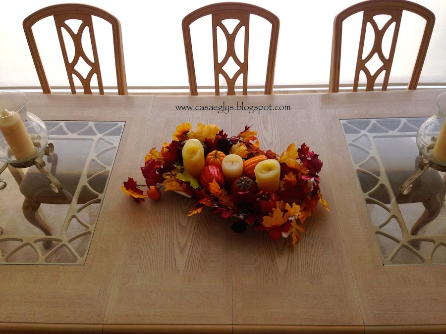 No se necesita ser un profesional en la decoración para realizar un sencillo pero bonito centro de mesa para darle la bienvenida al otoño. Lo que yo hice fue conseguir una guía de hojas de otoño, algunas hojas extras, calabazas de diferentes tamaños y colores, unas velas que tenia por casa ya usadas y un plato grande para que sea la base.