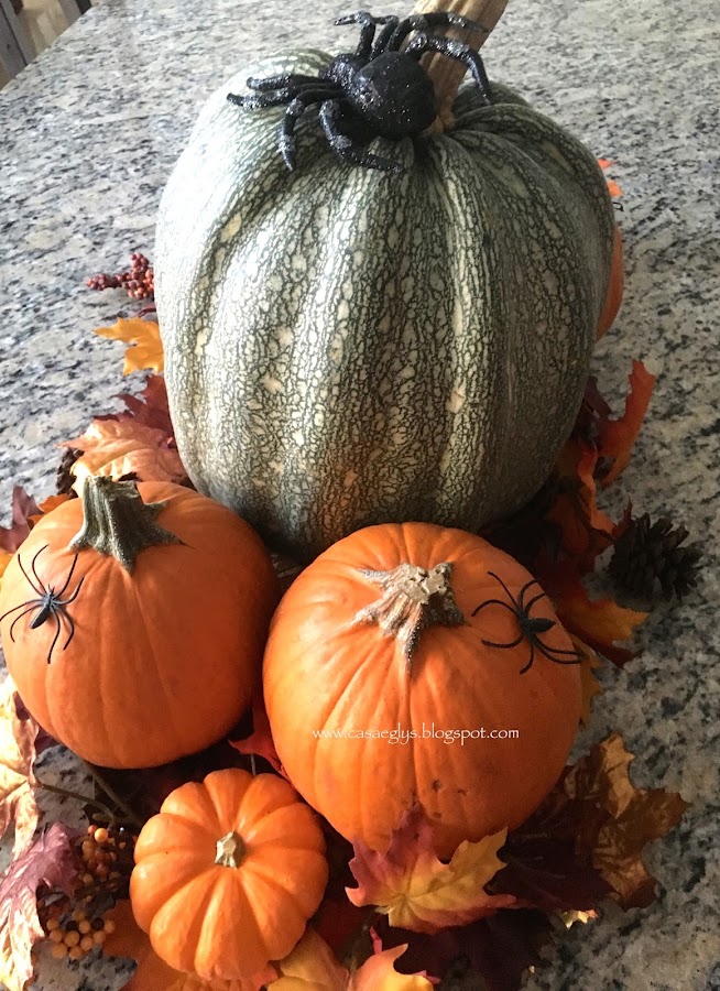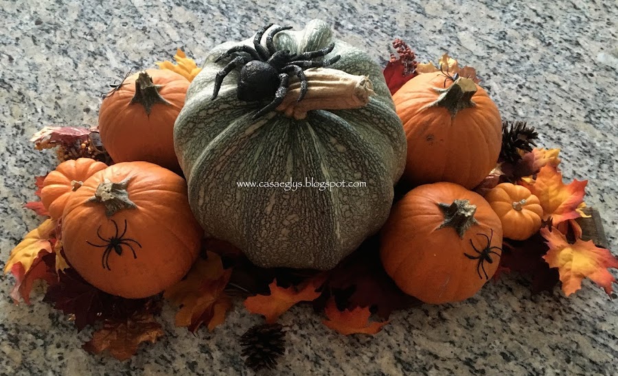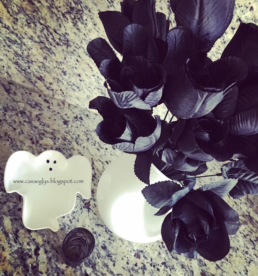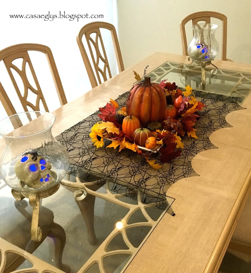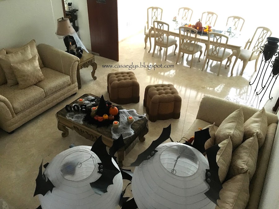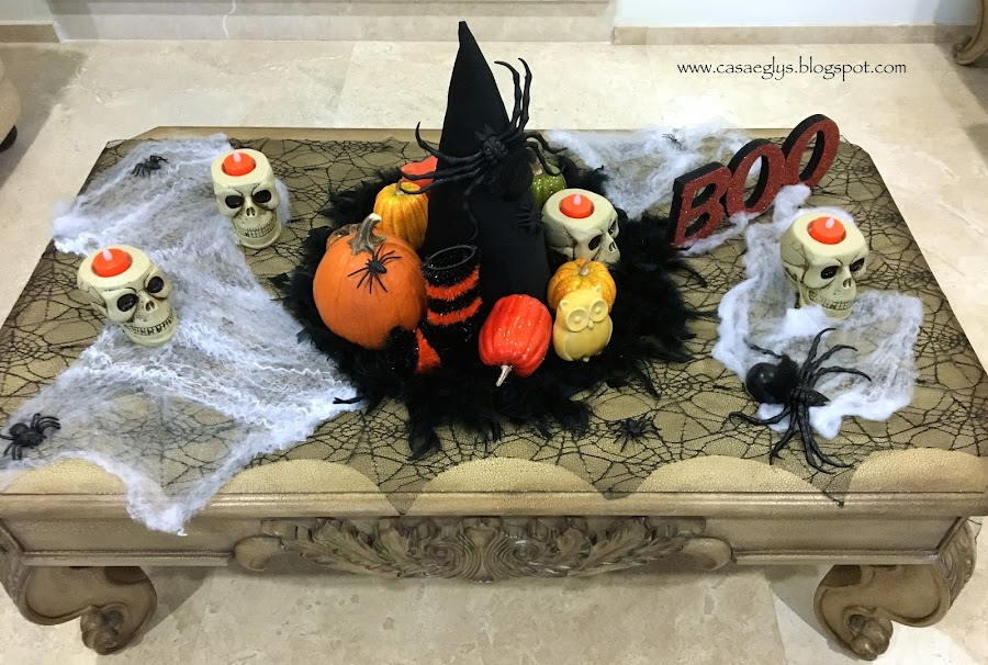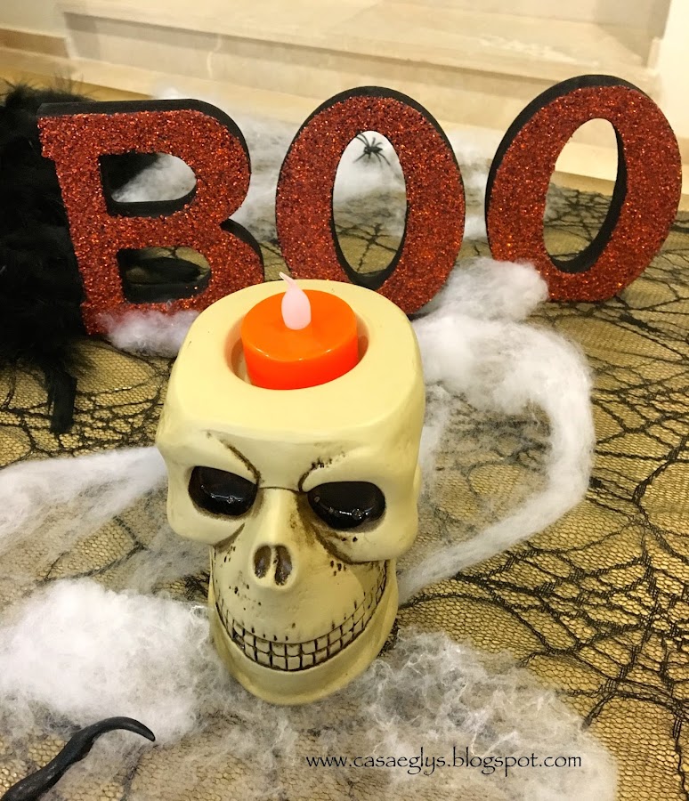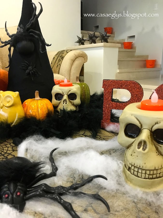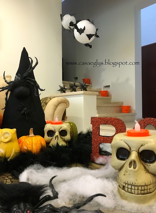 Y finalmente así quedo nuestro centro de mesa, con algunos otros detalles como telarañas y la palabra BOO que hicimos el año pasado.