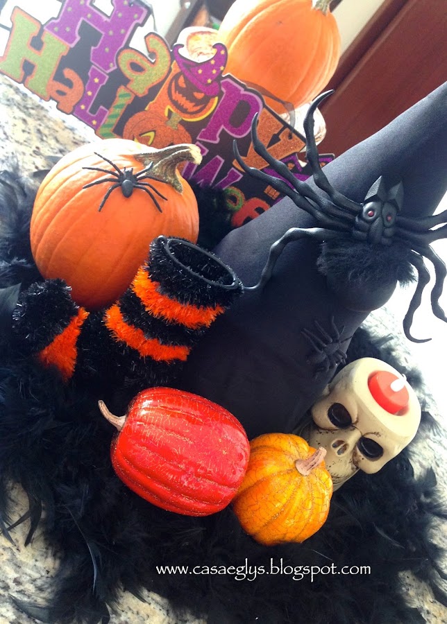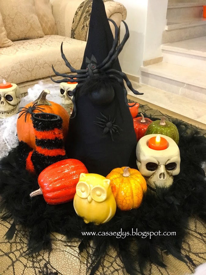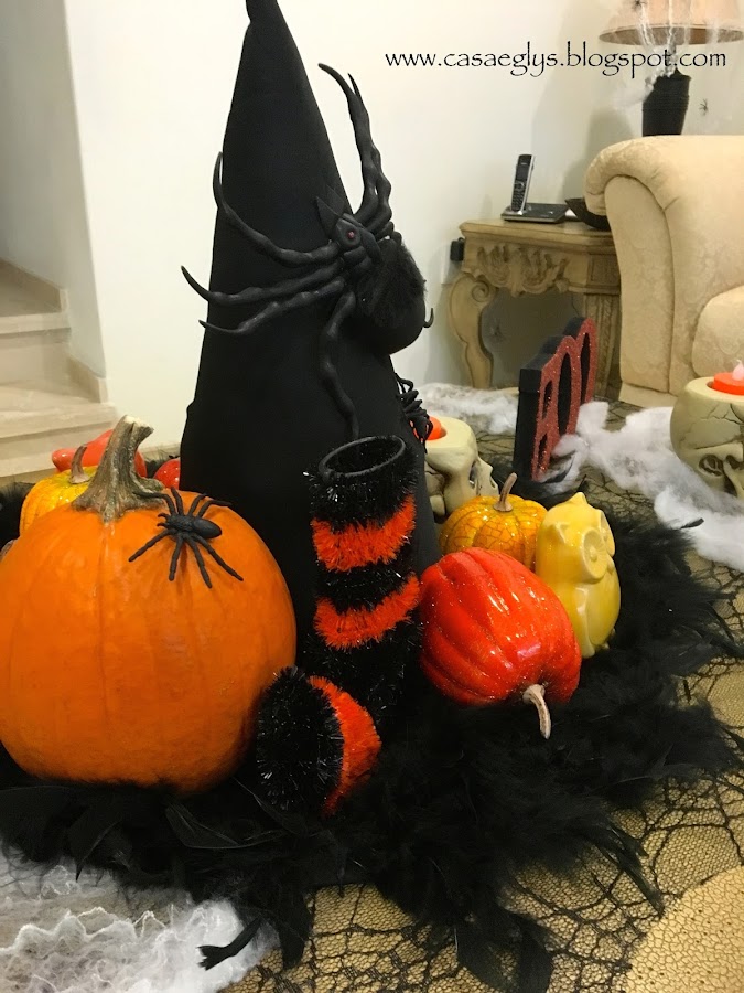 Y lo demás es colocar todos tus adornos alrededor del sombrero. Yo le pegue una araña gigante para darle un poco de realismo, jajaja!