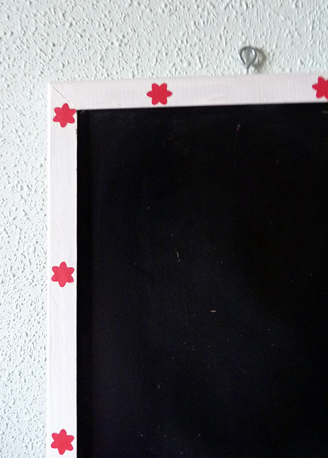 Ésta pizarra ya la tenemos un par de años, y ya estaba un poco desgastada porque encima era ya de segunda mano, la madera del marco estaba muy fea. Pero como aquí no se tira nada, he intentado darle una segunda oportunidad, y la verdad que me ha gustado el resultado.