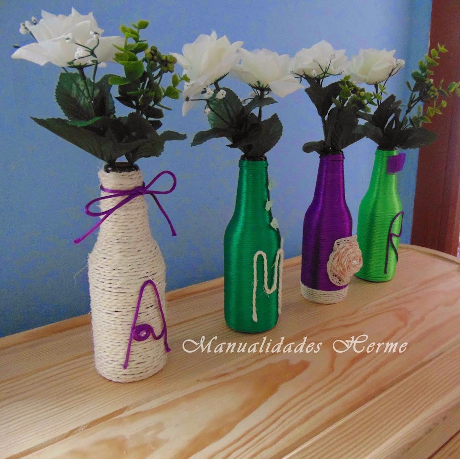 Con las mismas cuerdas escribí una letra a cada botella formando una palabra. La flor de la botella lila la hice con lazo y puntilla.