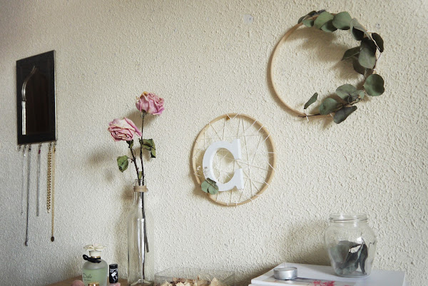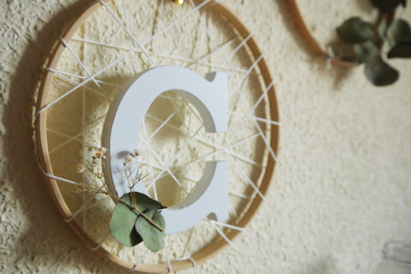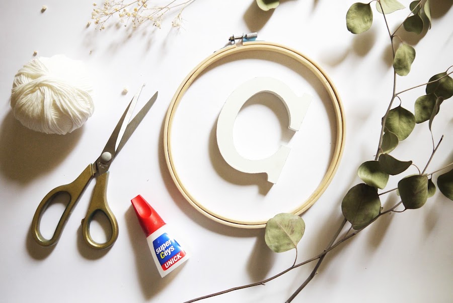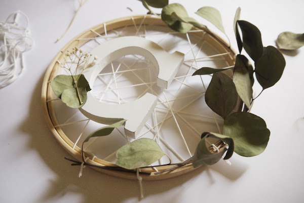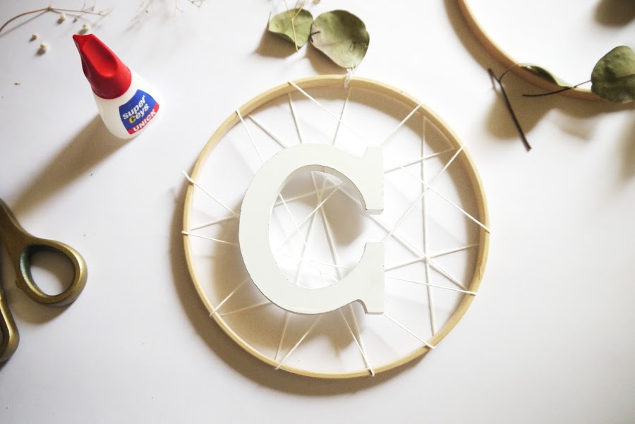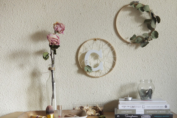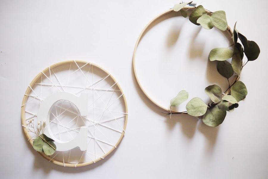 Al final la idea que más me gustó fue utilizar un bastidor de madera como base para crear una corona de eucaliptos. Pero como siempre, me gusta darle a todo mi toque personal y al final terminé combinándolo con cuerda, florecillas y mi inicial en madera blanca.