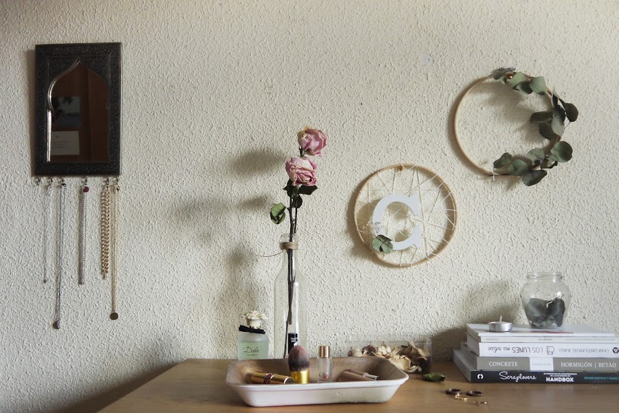 Las he puesto encima de mi tocador (una cómoda del Ikea), con unas rosas secas en una botellita de cristal; el espejo que me compré en Marruecos y que convertí en colgador de collares; unos cuantos libros (incluido el de Scraplovers ;) ); unas velas y la bandeja diy para todas las cositas de maquillaje diario.
