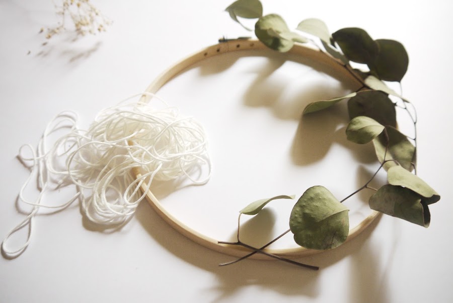 Átalos a la parte exterior del bastidor con ayuda de la lana, haciendo nudos en todas las ramitas para que no se muevan. Si lo necesitas, utiliza un poco de pegamento para fijar con mayor precisión el eucalipto.