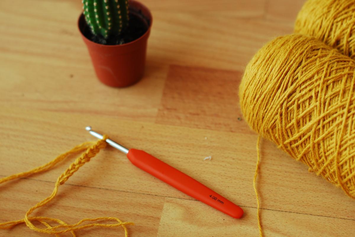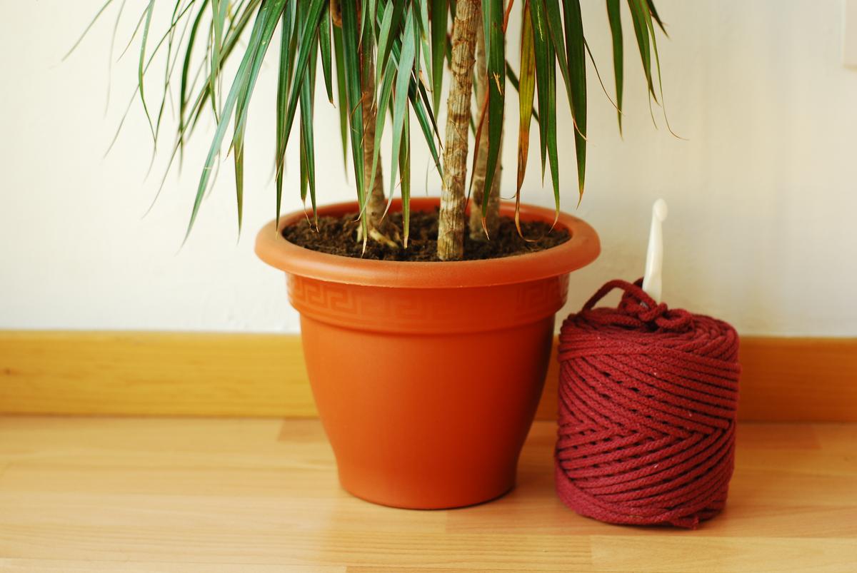 Solo necesitaremos la maceta en cuestión, el hilo que queramos usar (yo he usado más de un tipo diferente), una aguja de ganchillo acorde al hilo que usemos y la pistola de silicona.
