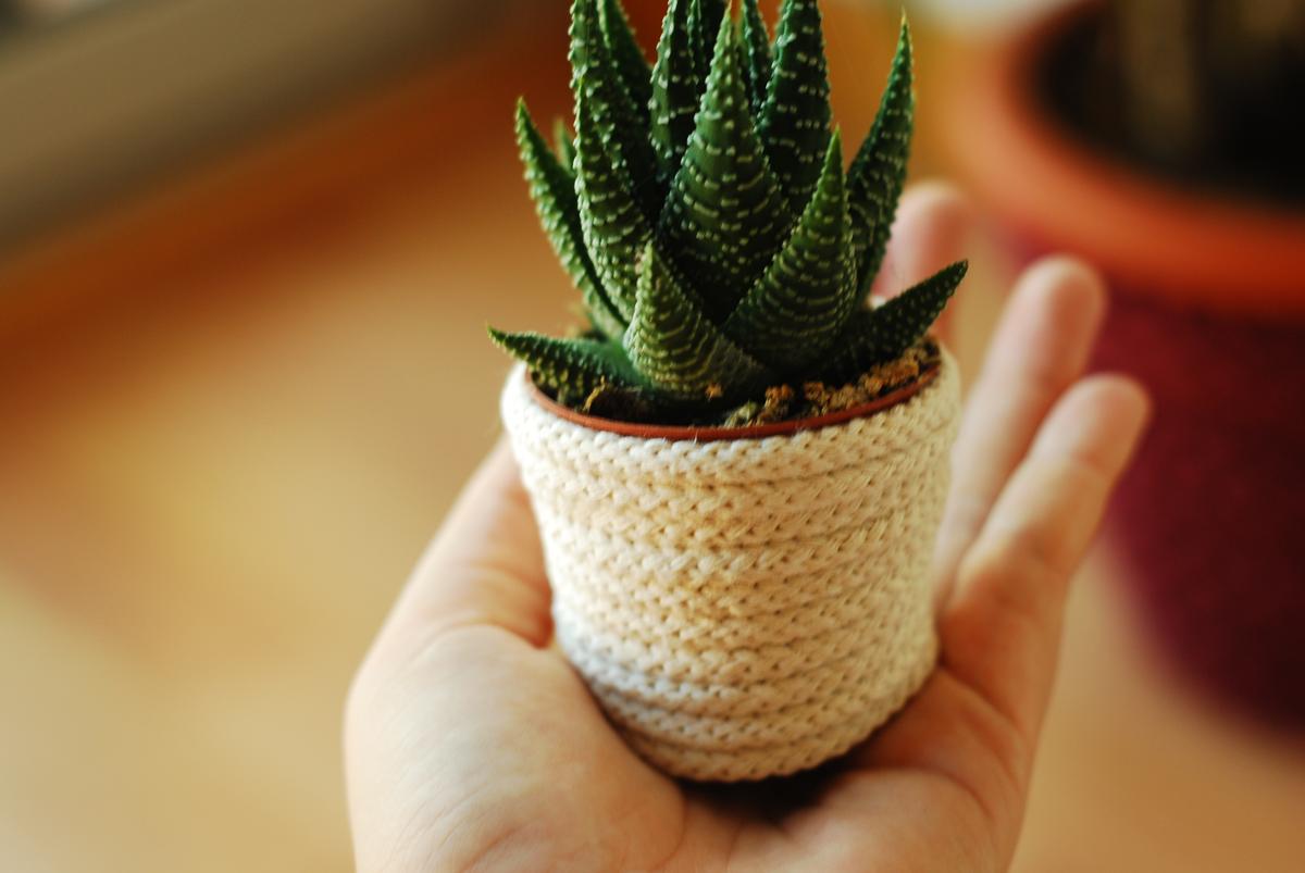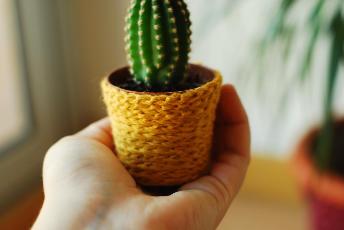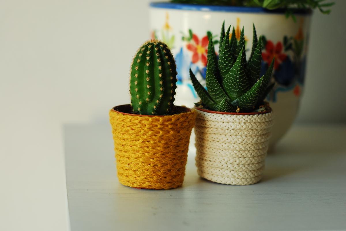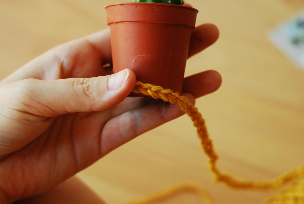 Aproveché que tenía dos mini cactus que también compré, y hice lo mismo. Con el hilo blanco no hice cadeneta, simplemente lo fui enrollando, y con la lana mostaza usé una aguja de ganchillo del número 4.