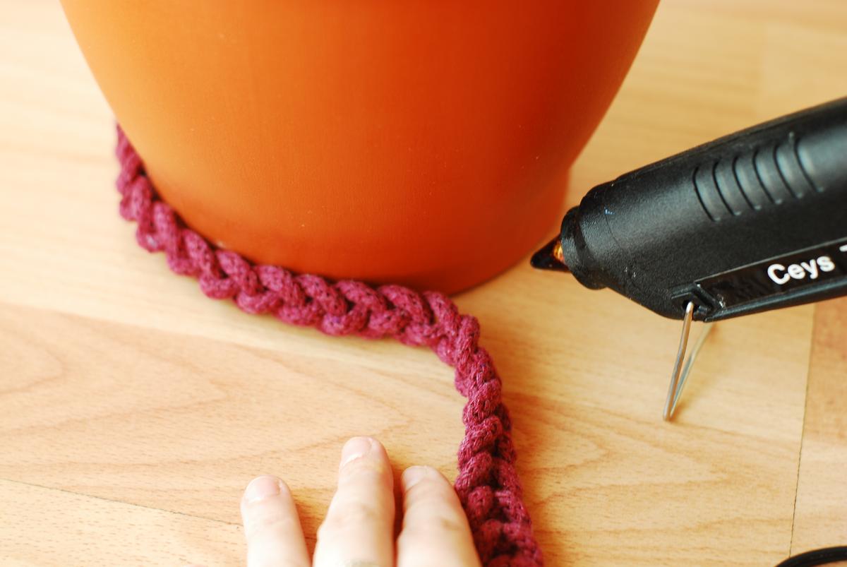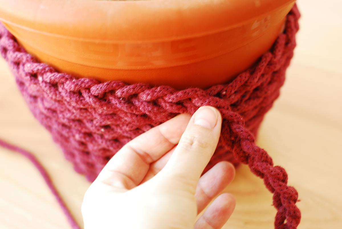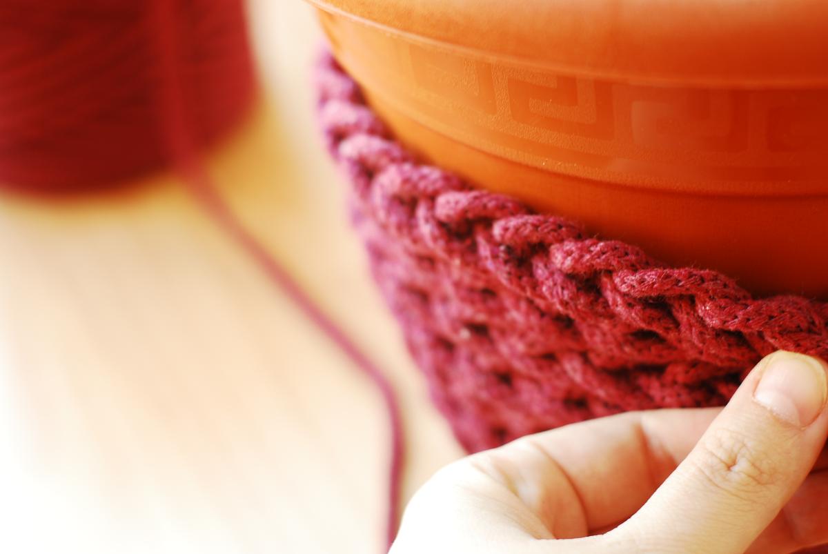 Una vez la tenemos, empezaremos enrollando la cadeneta a la maceta, empezando por la base y teniendo cuidado que nos quede la parte “bonita” por fuera, así irá haciendo una especie de trenzado.