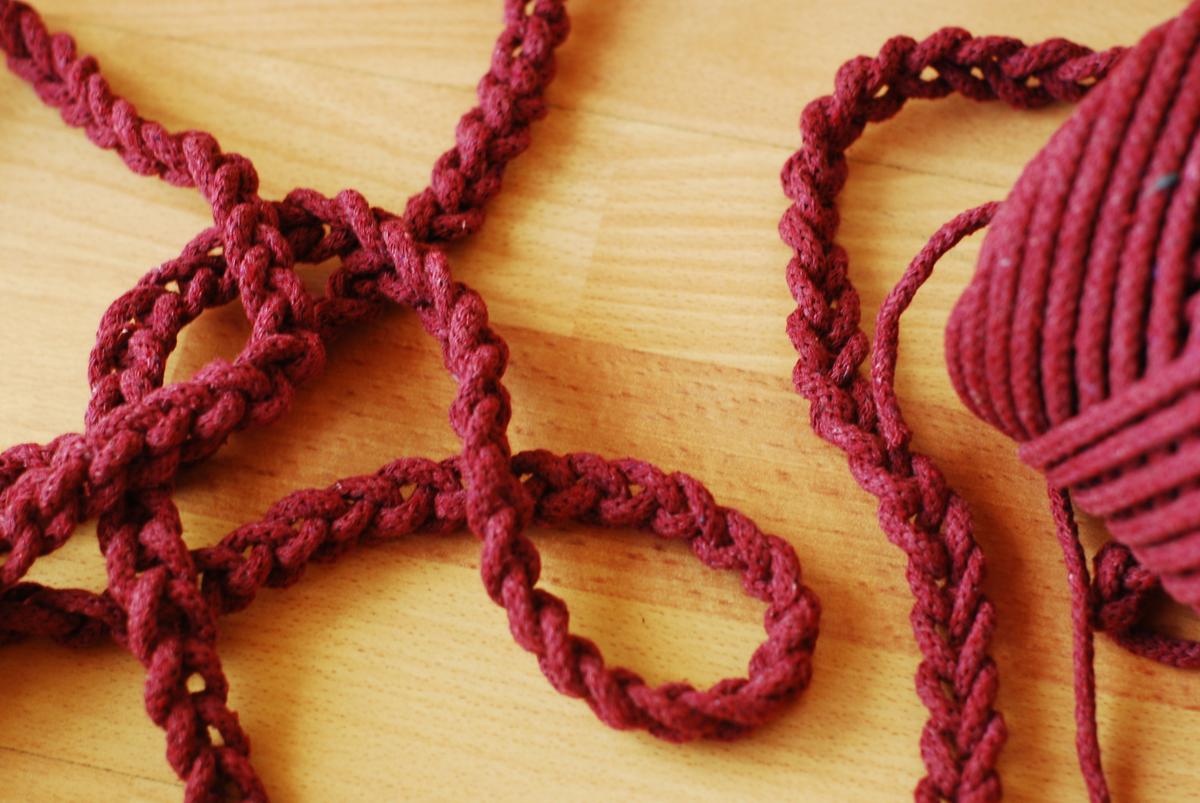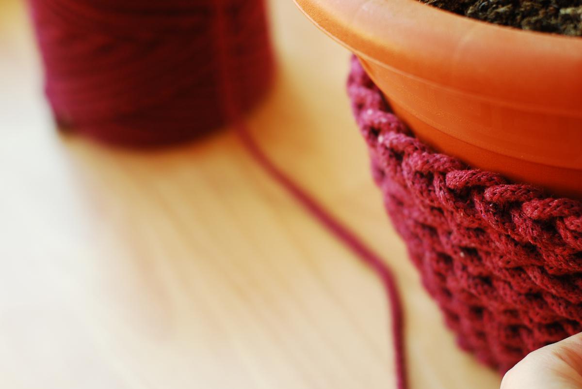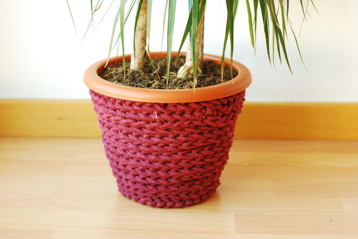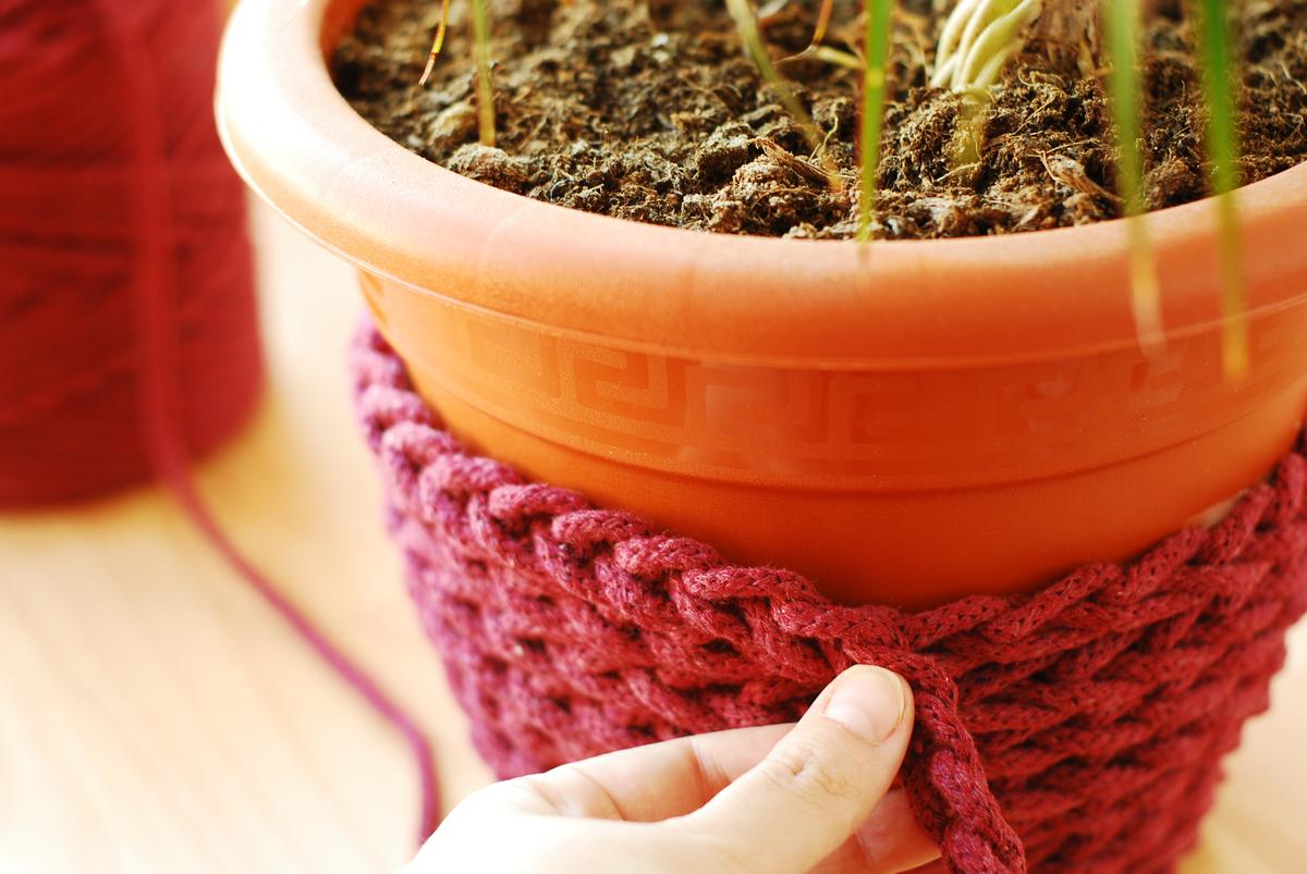 Una vez la tenemos, empezaremos enrollando la cadeneta a la maceta, empezando por la base y teniendo cuidado que nos quede la parte “bonita” por fuera, así irá haciendo una especie de trenzado.