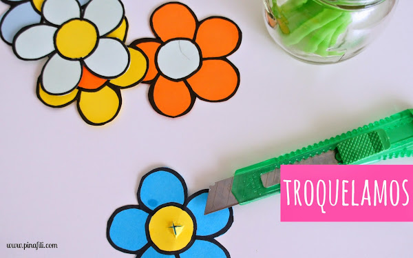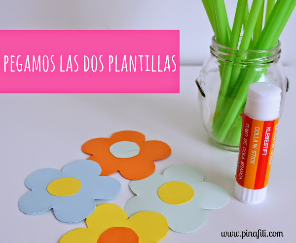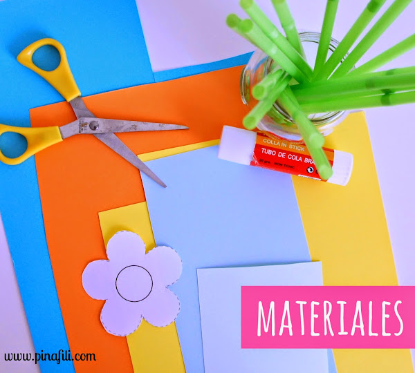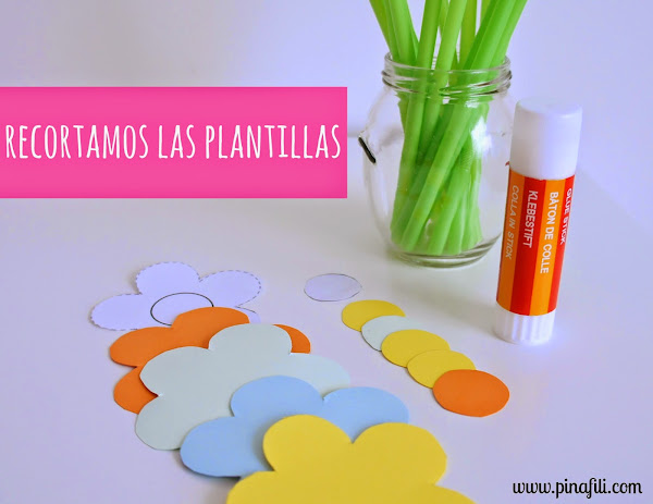 Los materiales que necesitamos son de lo más básico, seguro que los tenemos todos por casa: Cartulinas de colores, pegamento, pajitas ( si son verdes mejor, así parecerán el tallo de las flores, pero seguro que con cualquier color quedan estupendas ), tijera,la plantilla de una flor, lápiz, rotulador y un cúter...los reunimos todos y empezamos.