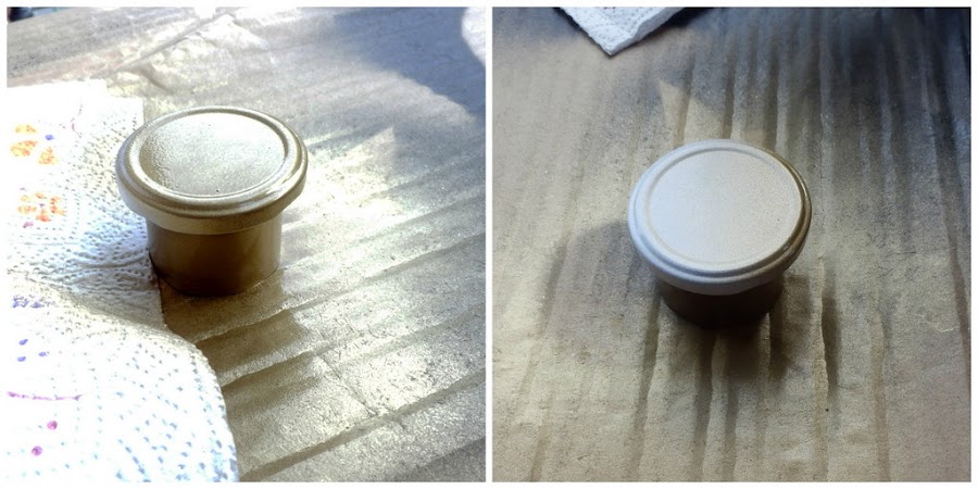 Lo primero es limpiar con un trapo y alcohol tanto los tarros como las tapas, sobre todo estas últimas para que la pintura agarre bien.