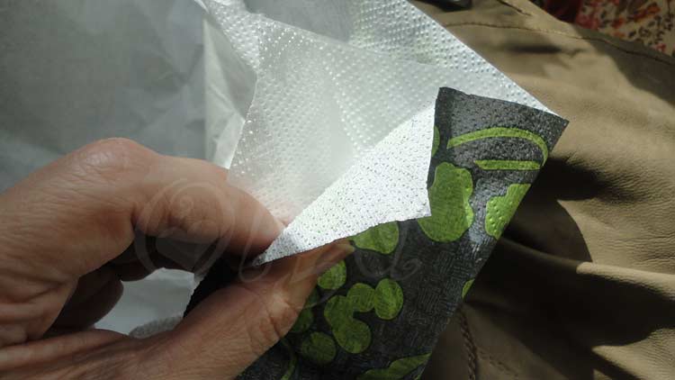 Ya sabes que las servilletas llevan tres capas, quitale las dos blancas y quedate sólo con la que lleva el dibujo impreso.