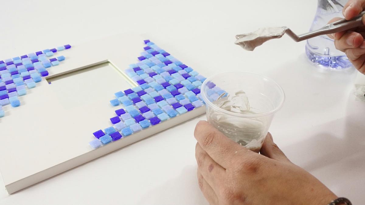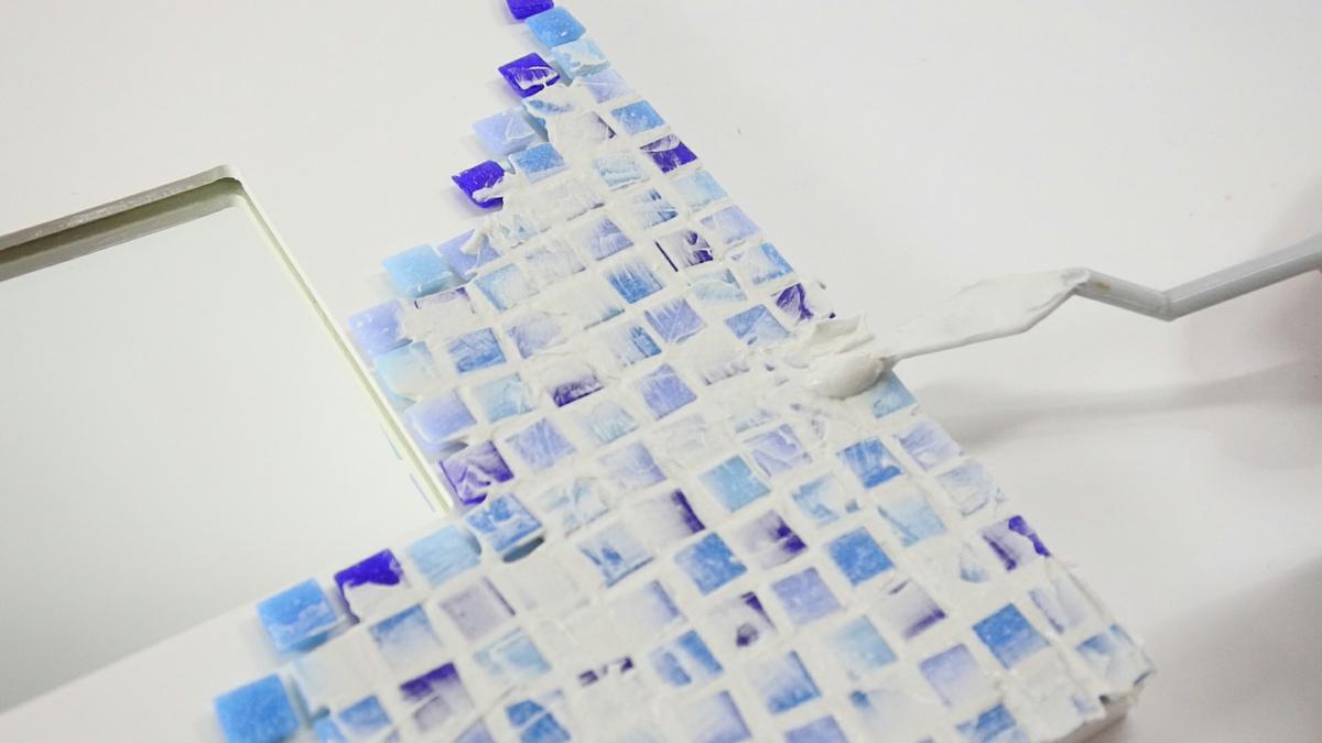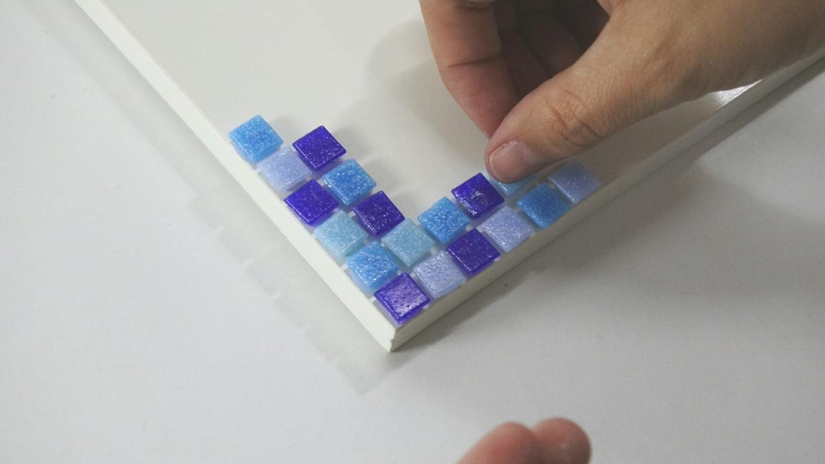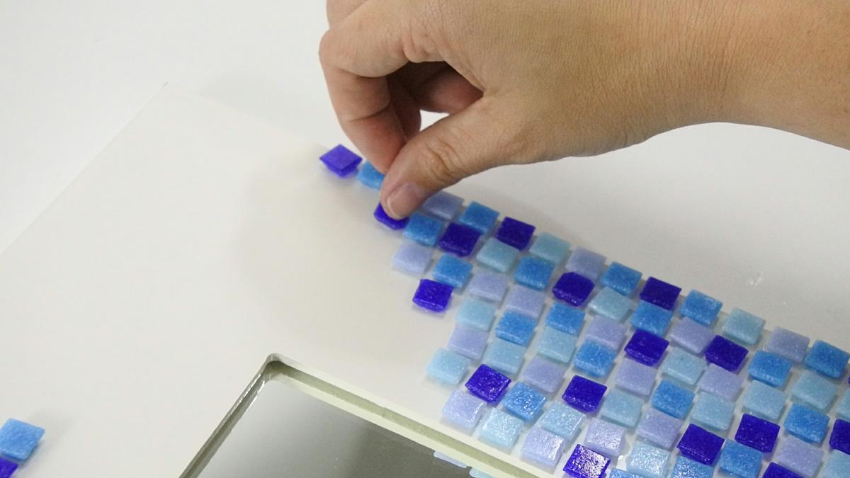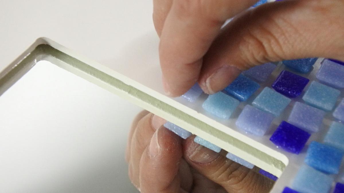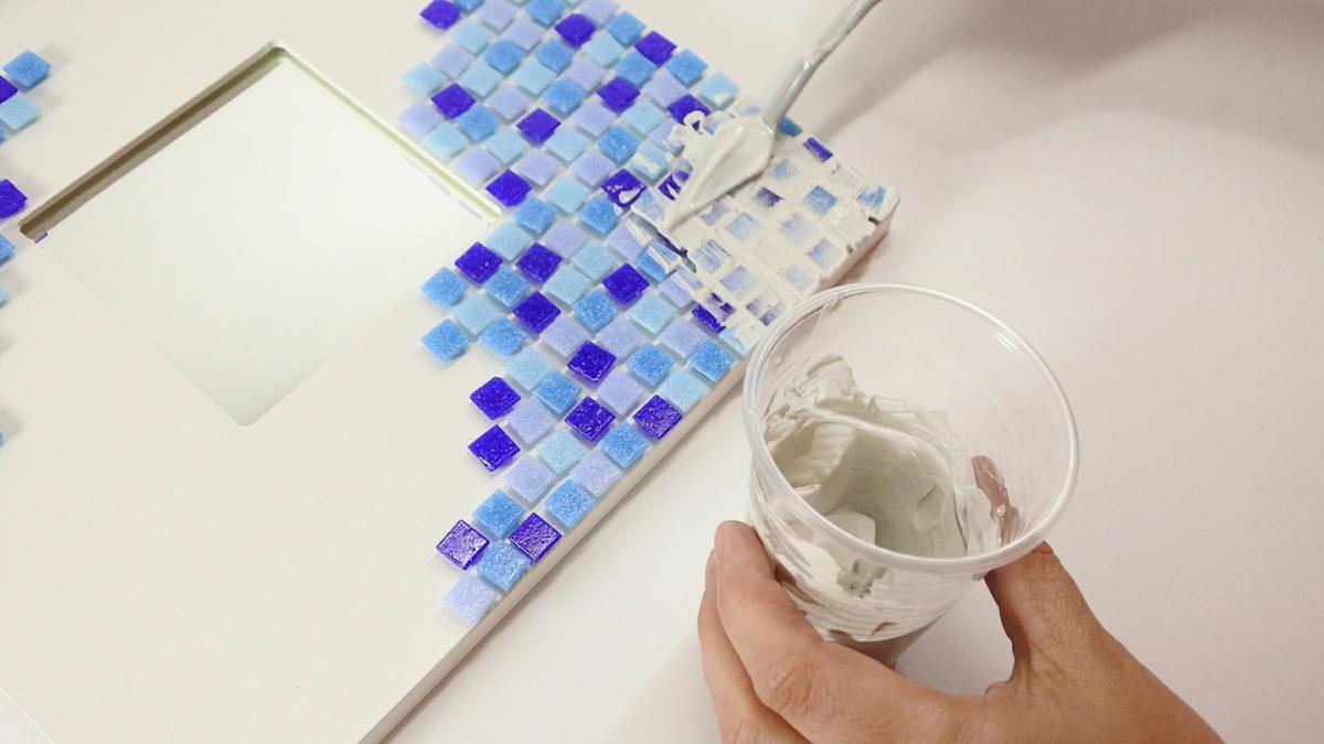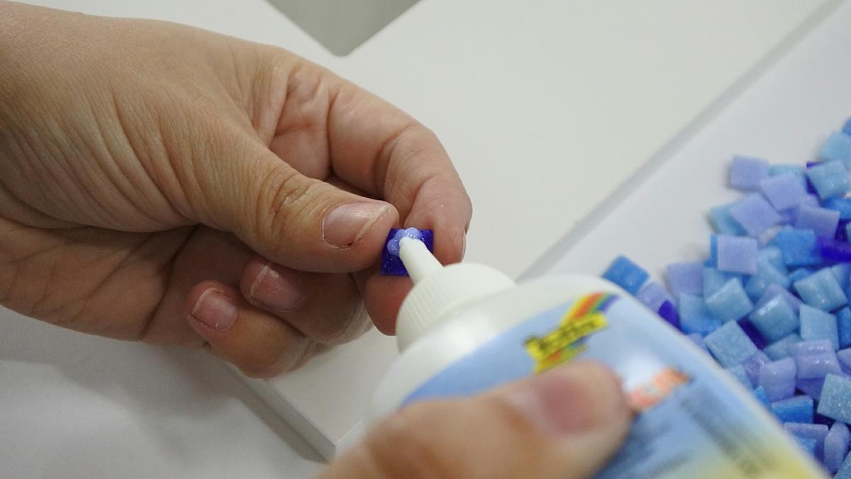 Para pegar los cristales tan solo tenemos que poner una pequeña gota de cola sobre el reverso de las teselas y pegamos donde deseemos.