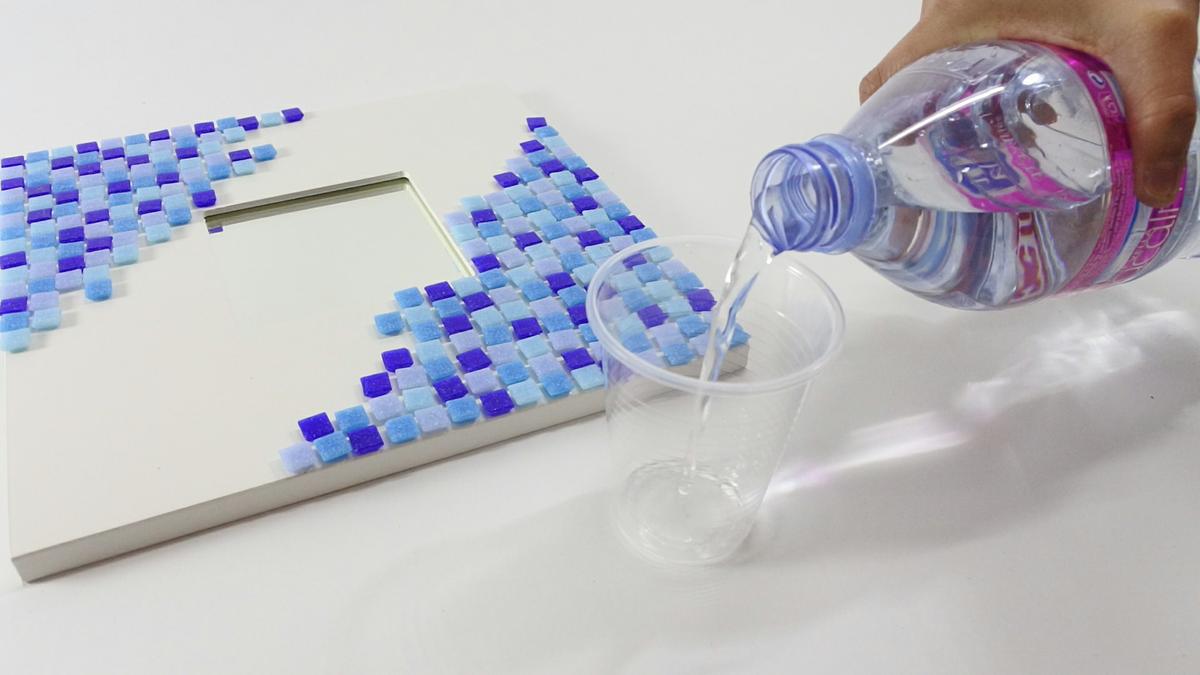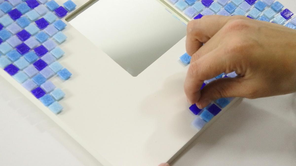 El paso a paso es sencillísimo. Primero vamos pegando los cristales por el marco del espejo con la disposición que más nos guste. Podemos llenarlo todo, pegar solo por algunos lugares… En nuestro caso, hemos decidido completar dos de las cuatro esquinas del marco.